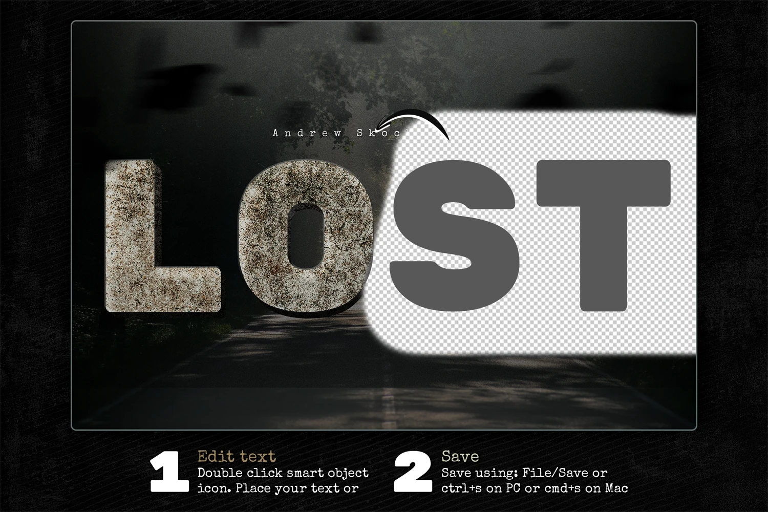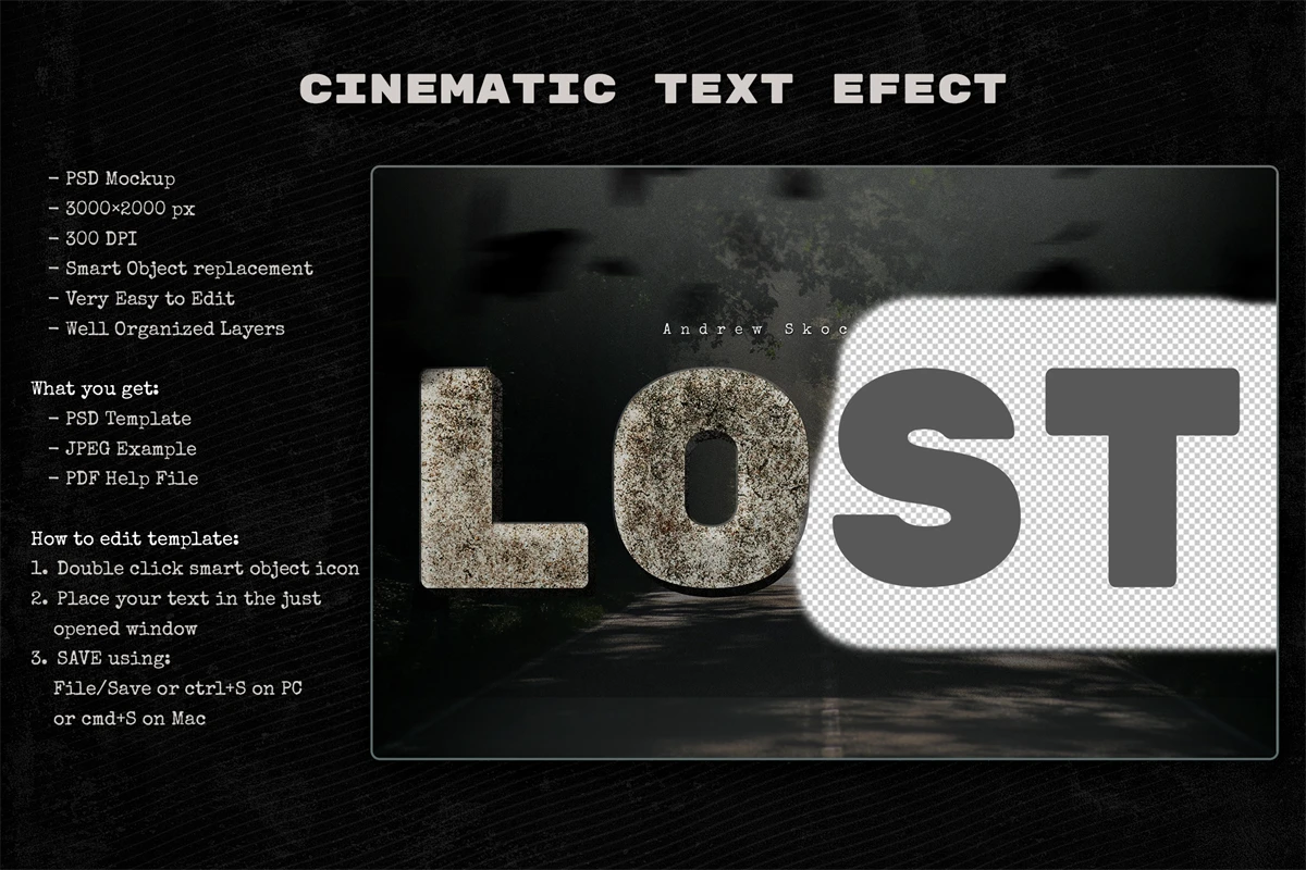 Its so easy to use this Photoshop template! The main text is editable by changing inside the smart object. Font link is included. But it perfectly works with any other fonts. Good for cinematic logos, cinematic titles, Instagram, Facebook, YouTube, banners, post cards, social media posts etc.