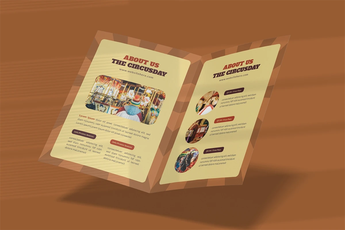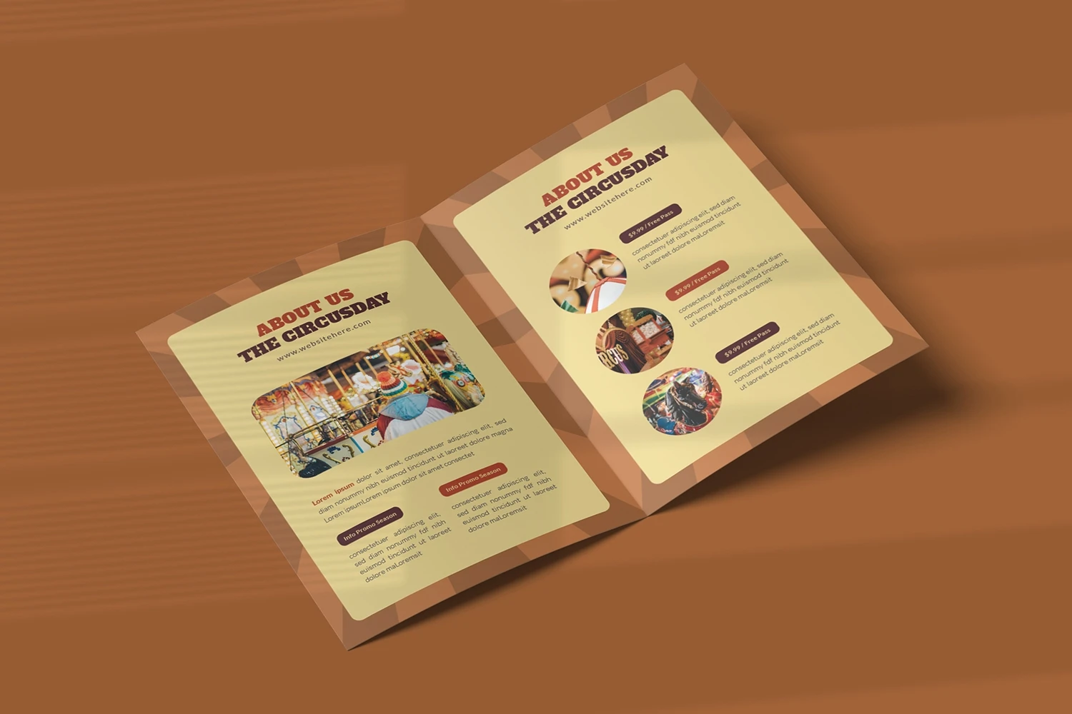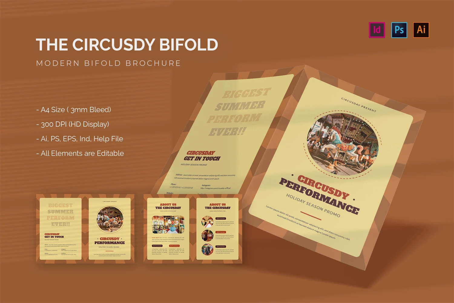 Circusdy Perform - Bifold Brochure We present this Bifold Brochure for you, simple and very elegant, and this Bifold Brochure is suitable for all types of your business, made with Adobe InDesign (INDD), Adobe Photoshop (PSD) and Adobe Illustrator (AI), very easy to customize, Hope you Like it, dont forget to rate, Thanks.