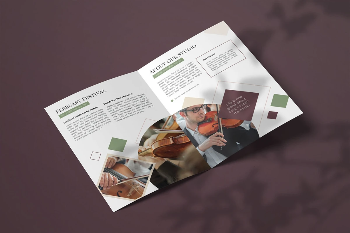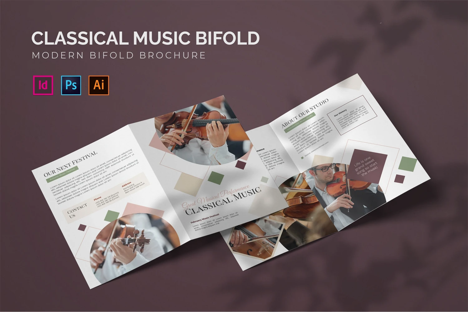 Classical Music - Bifold Brochure We present this Bifold Brochure for you, simple and very elegant, and this Bifold Brochure is suitable for all types of your business, made with Adobe InDesign (INDD), Adobe Photoshop (PSD) and Adobe Illustrator (AI), very easy to customize, Hope you Like it, dont forget to rate, Thanks.