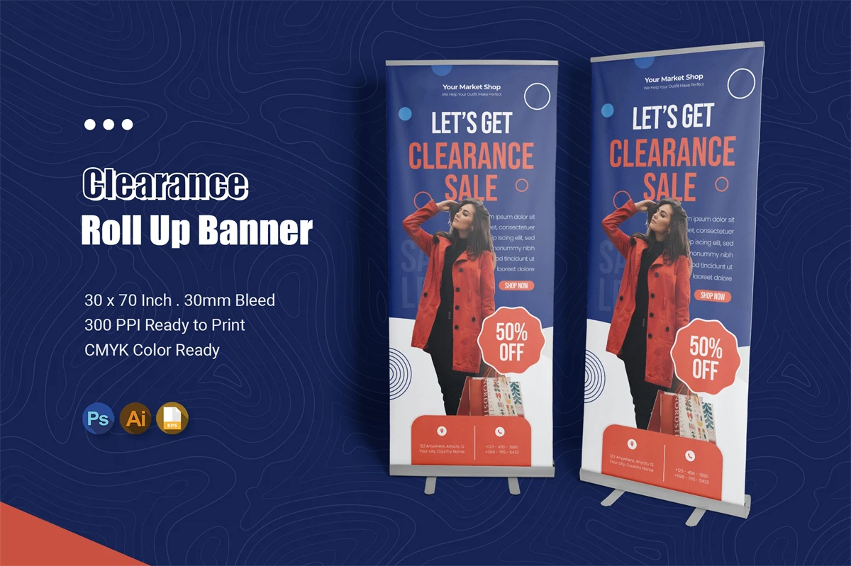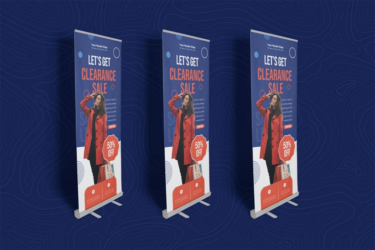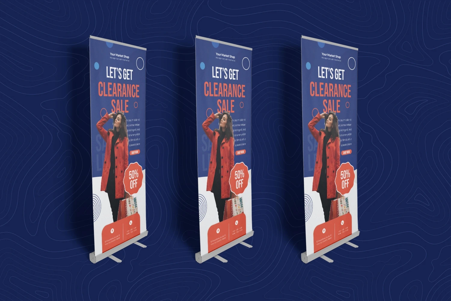 Our roll-up banner template tells your brand's story at a glance. This design stands out and can be used to showcase pictures and content effectively.