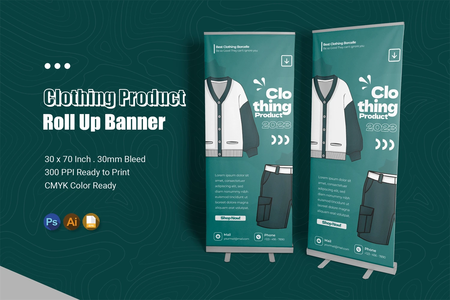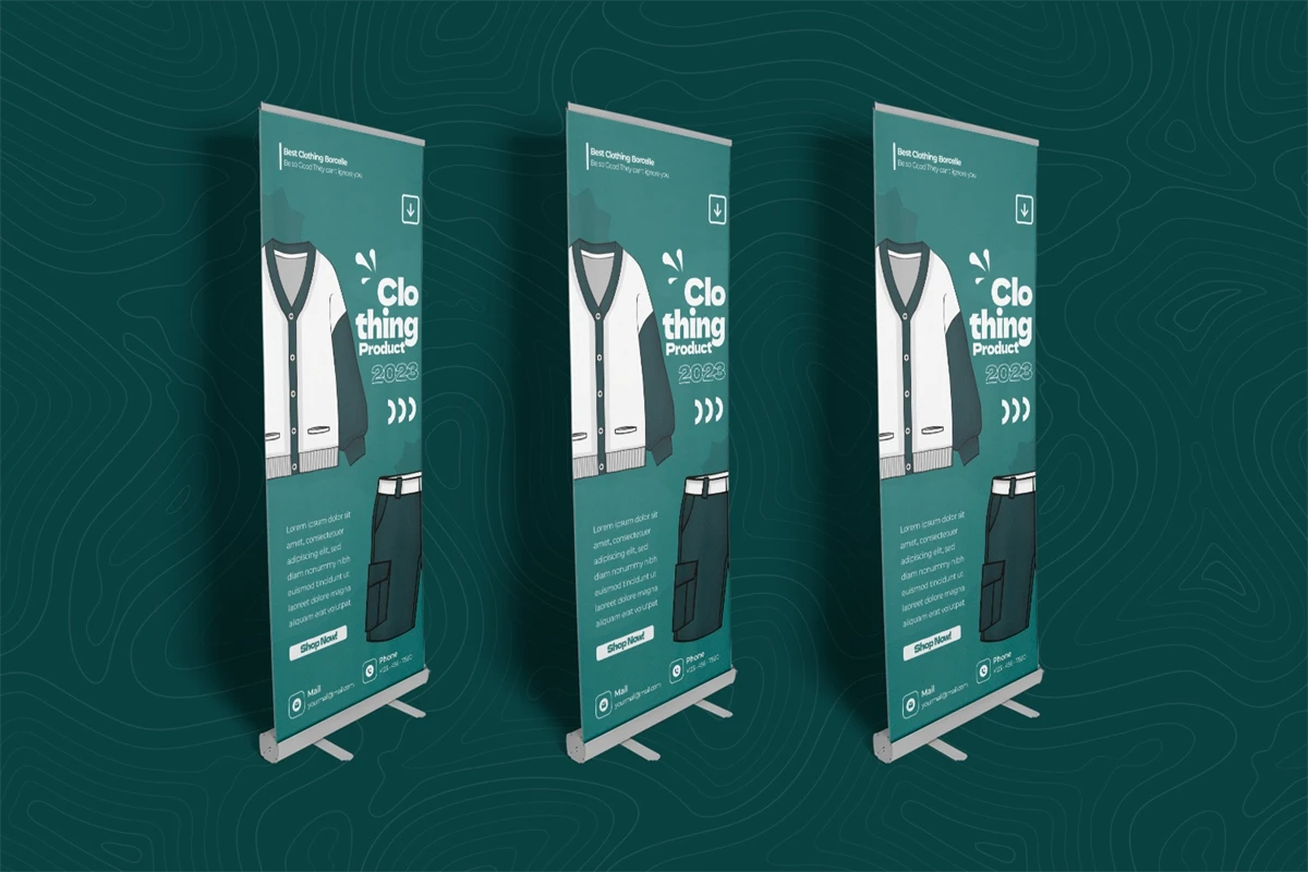 Our roll-up banner template tells your brand's story at a glance. This design stands out and can be used to showcase pictures and content effectively.
