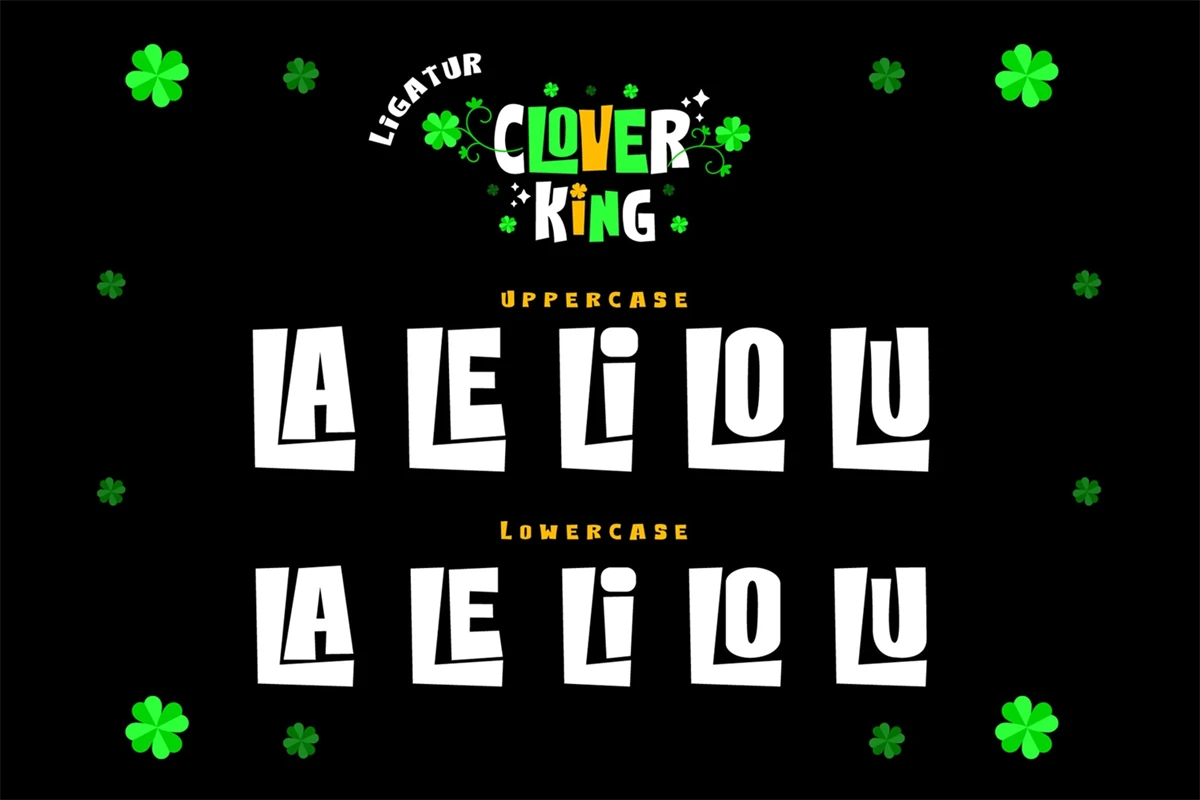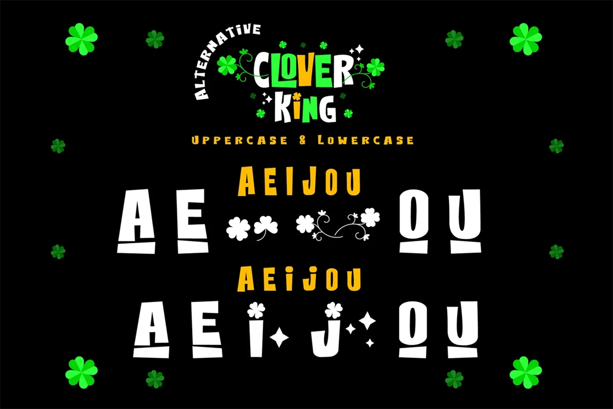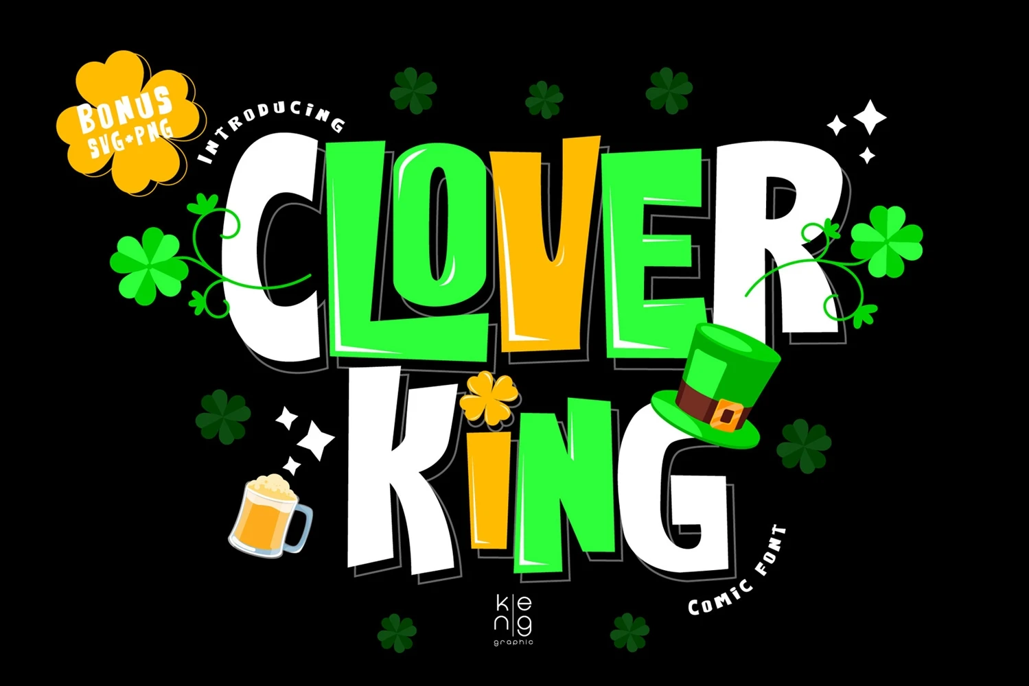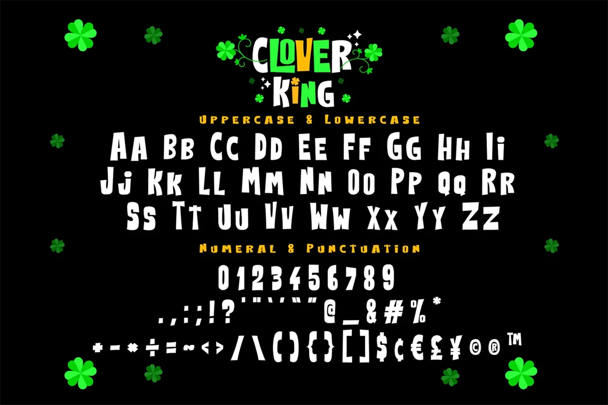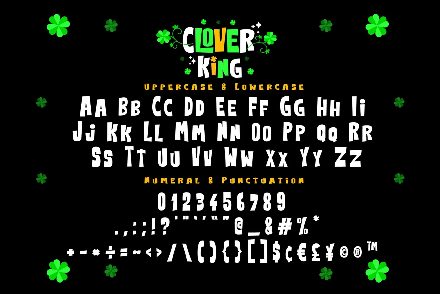 Clover King is an eye-catching and modern display font. The unique style of this font will be instantly recognizable and will attract attention. It will work great for comic book style, online games, cards, love shirts, posters, movie titles, eye-catching social media posts, or anything that requires youthfulness and courage. It is also PUA encoded which means you can access all of the glyphs and swashes with ease!