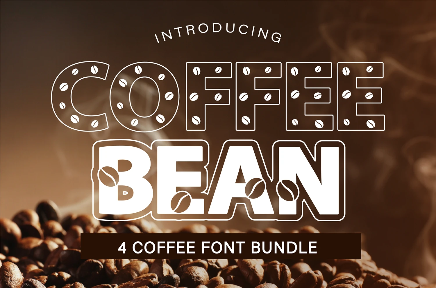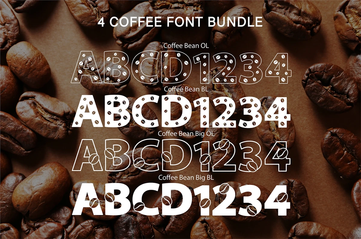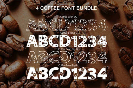 Coffee Bean included 4 font bundle. Each one is decorate with coffee bean detail in outline and bold style. Perfect for create a coffee menu, brand theme, online post title, etc.