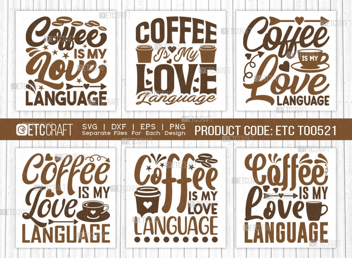 "Coffee Is My Love Language SVG Bundle" is a treasure trove of delightful designs that encapsulate the adoration for coffee in captivating typography. Craft mesmerizing coffee-themed products effortlessly and spread the coffee love wherever you go. Whether you're a coffee enthusiast or a business owner seeking new design inspirations, this bundle will undoubtedly add charm and flair to your projects.