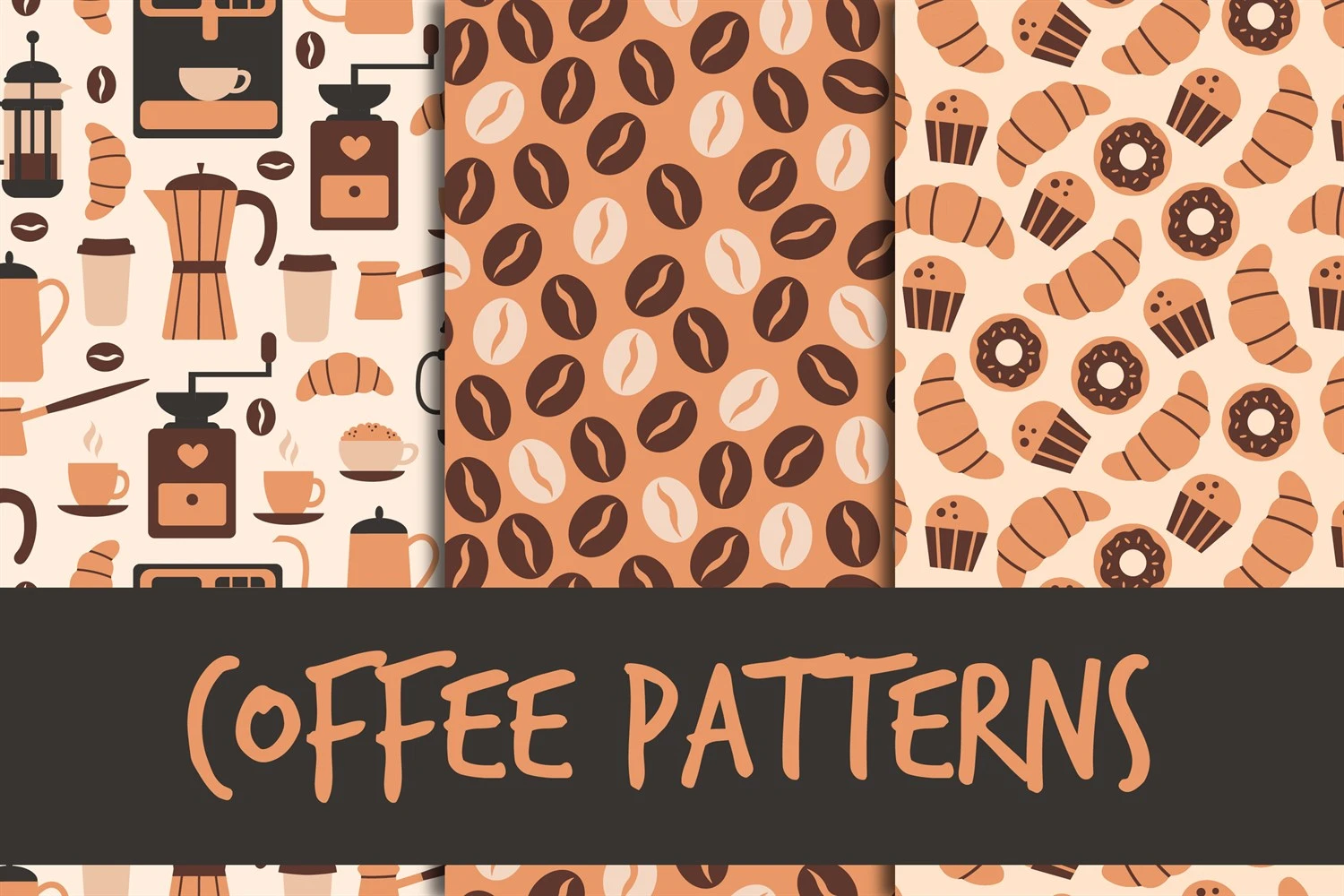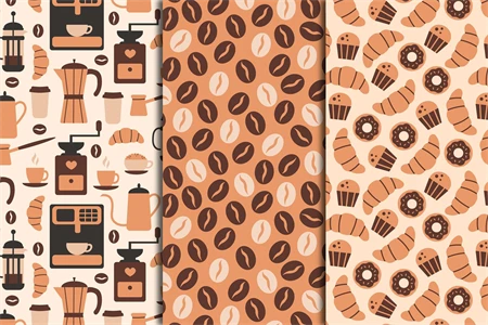 Coffee seamless patterns and digital papers collection includes 3 trendy endless backgrounds with coffee shop equipment and cups, coffee beans and sweet pastry food elements in minimal flat style. Cute and cozy coffee patterns set is perfect for cafe, restaurant, menu, delivery, barista, bar, coffee shop, kitchen, fabric, textile, wallpaper, wrapping paper, business and greeting cards, stationery, book cover, home decoration, scrapbooking, etc.