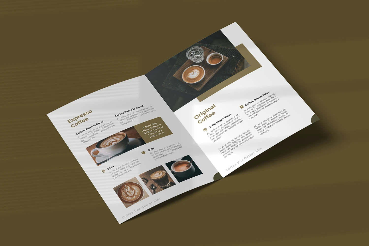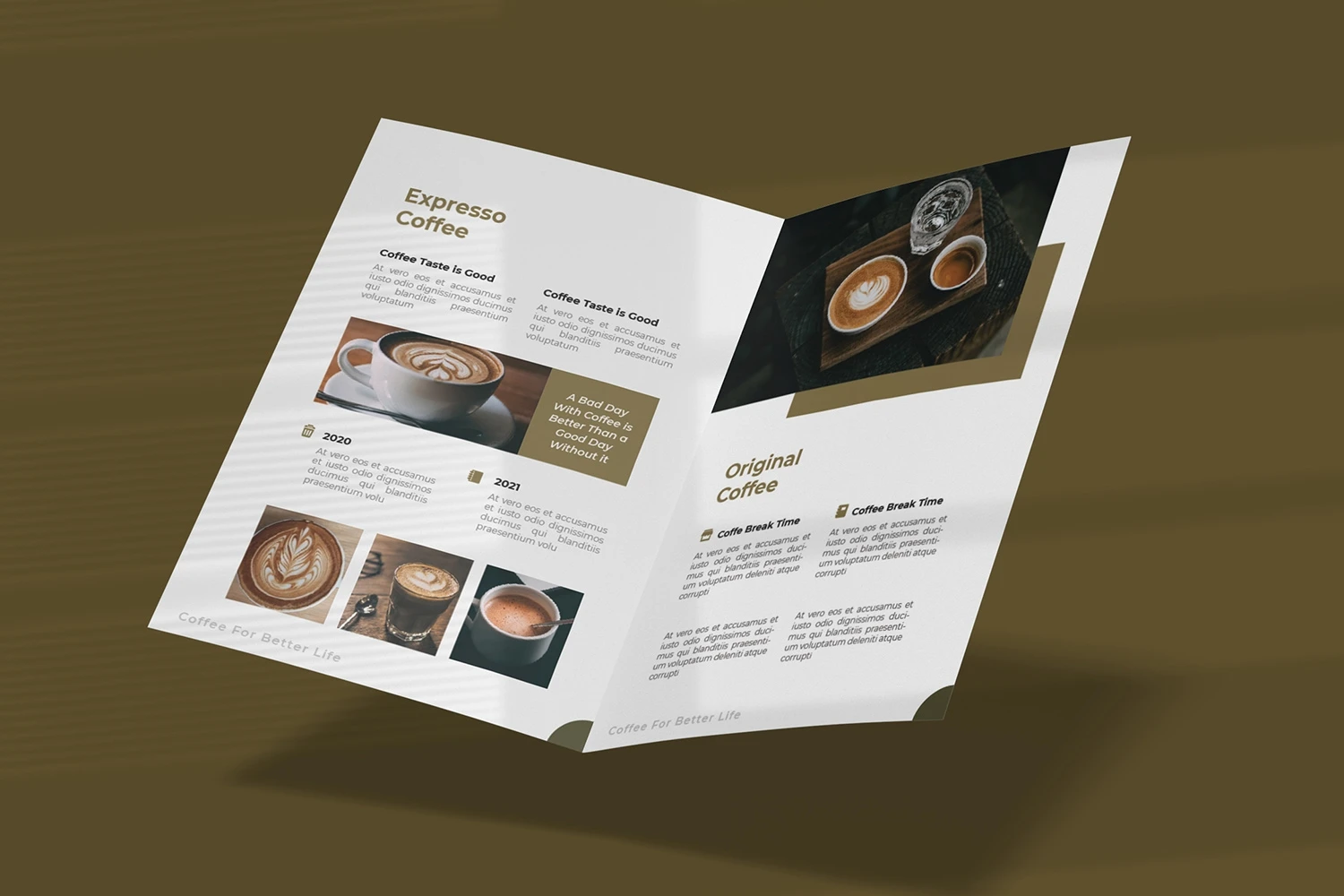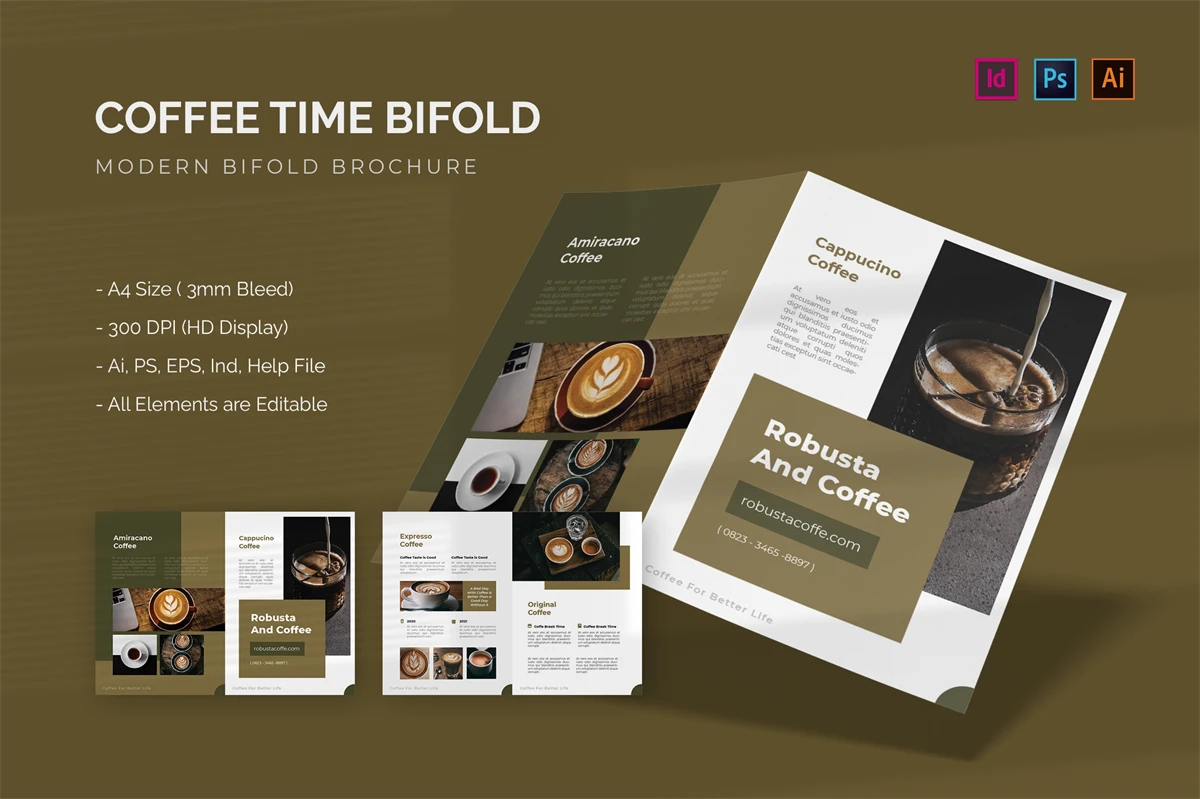 Coffee Time - Bifold Brochure We present this Bifold Brochure for you, simple and very elegant, and this Bifold Brochure is suitable for all types of your business, made with Adobe InDesign (INDD), Adobe Photoshop (PSD) and Adobe Illustrator (AI), very easy to customize, Hope you Like it, dont forget to rate, Thanks.
