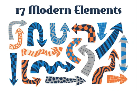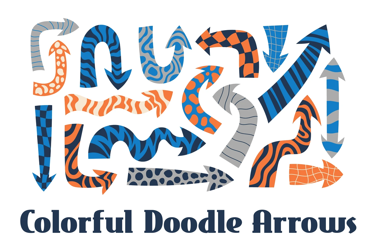 17 hand-drawn dynamic arrows decorated with grids, checkerboards, and wavy textures. Trendy doodle style. Vector illustration. Template for social media, presentation, infographic.