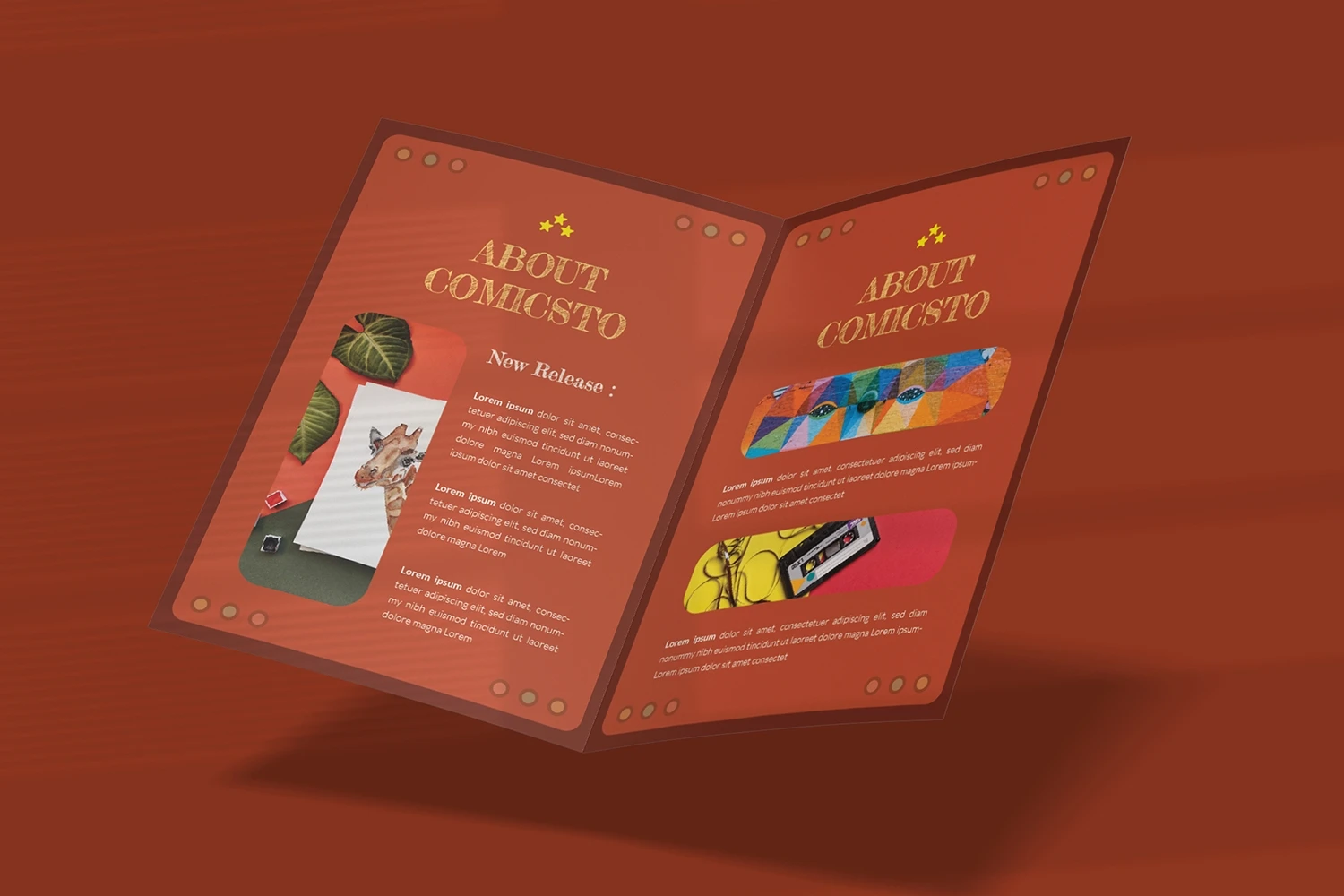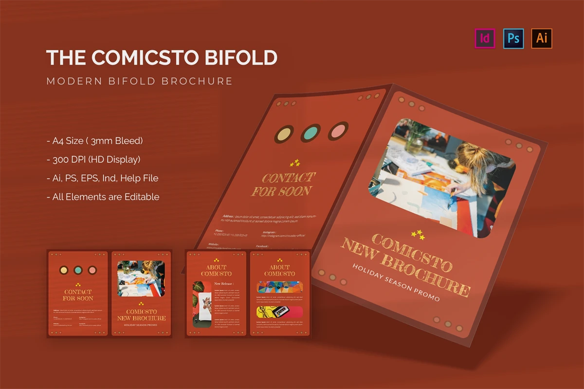 Comicsto - Bifold Brochure We present this Bifold Brochure for you, simple and very elegant, and this Bifold Brochure is suitable for all types of your business, made with Adobe InDesign (INDD), Adobe Photoshop (PSD) and Adobe Illustrator (AI), very easy to customize, Hope you Like it, dont forget to rate, Thanks.