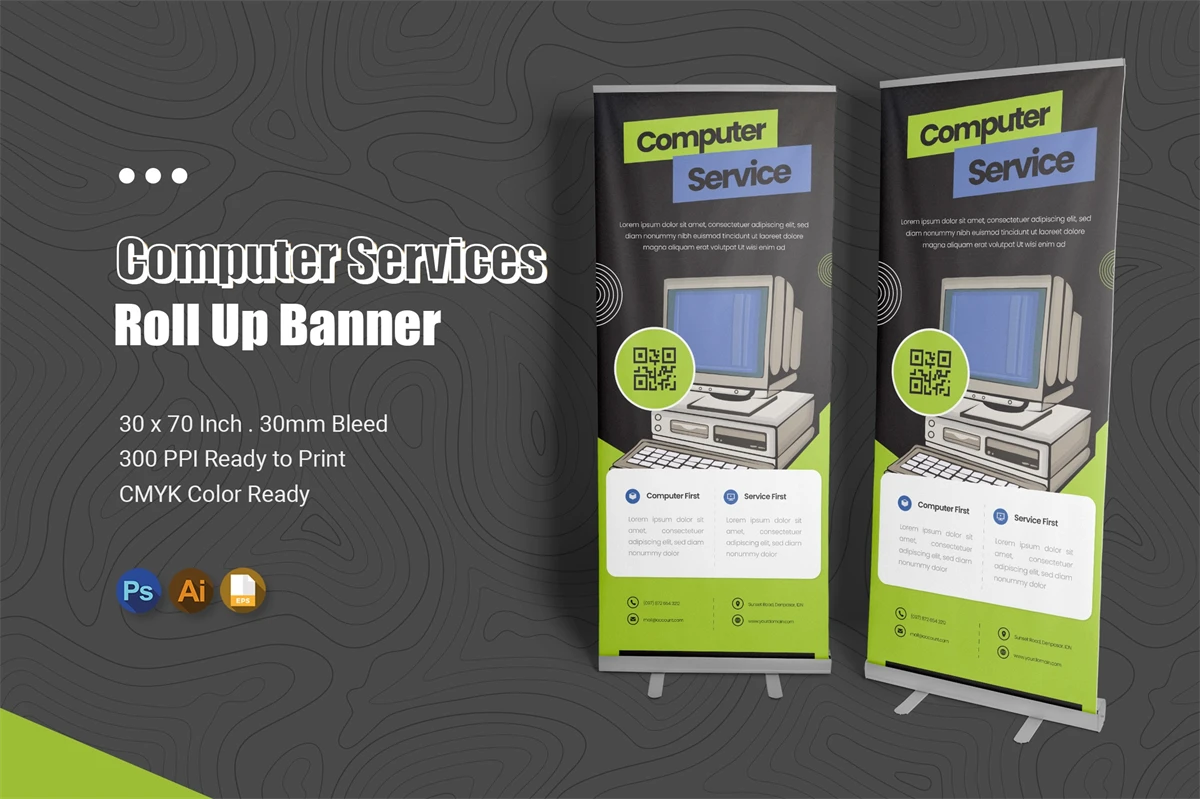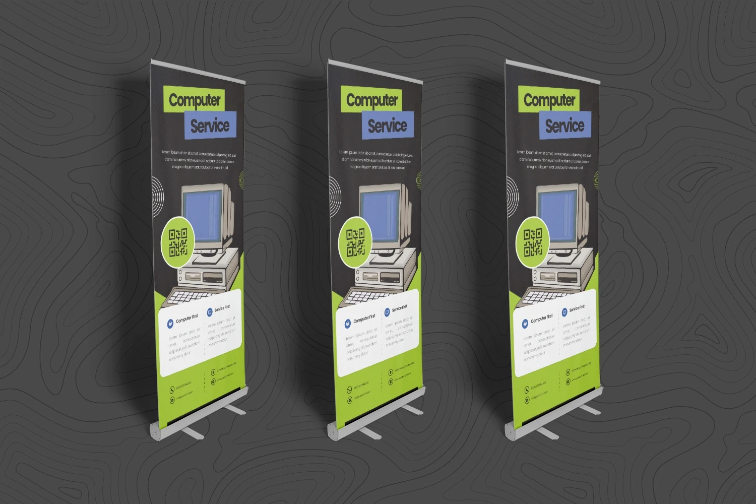 Our roll-up banner template tells your brand's story at a glance. This design stands out and can be used to showcase pictures and content effectively.