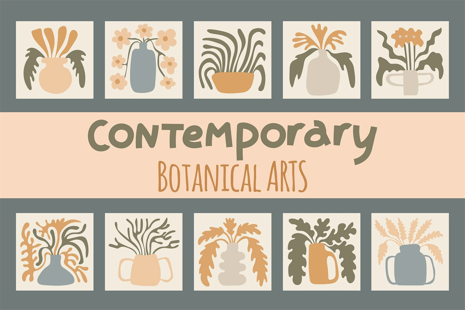 Trendy abstract Matisse inspired minimal melting houseplants in flowerpots. Wavy botany interior illustrations. Modern flowers and leaves in vases. Curvy aesthetic art. Groovy floral posters and cards.