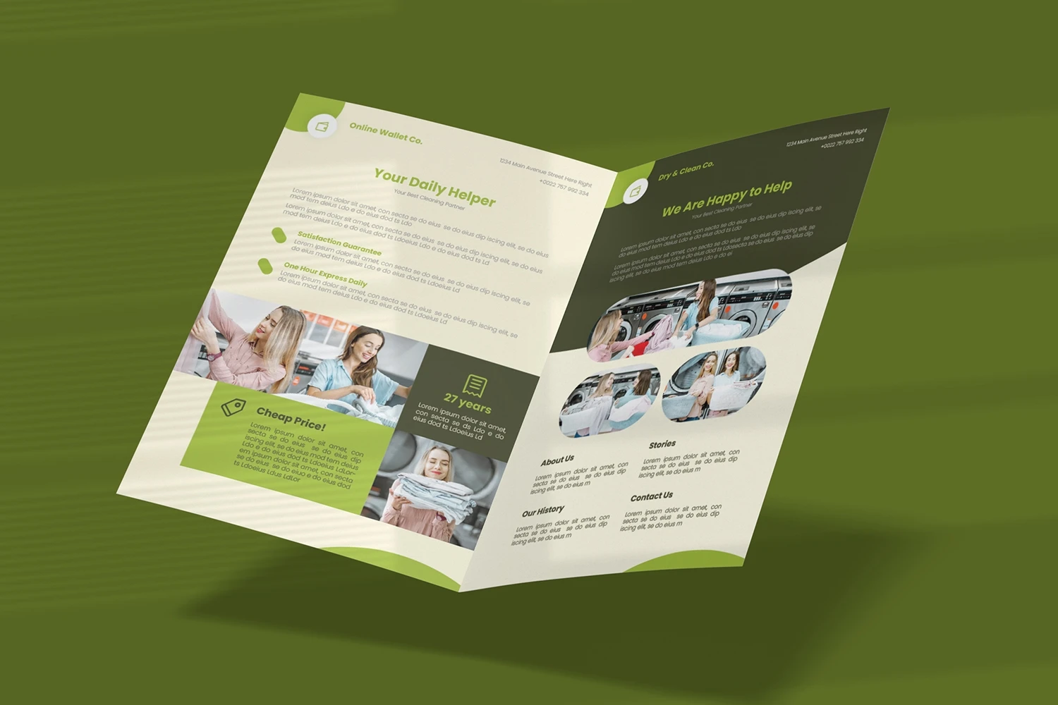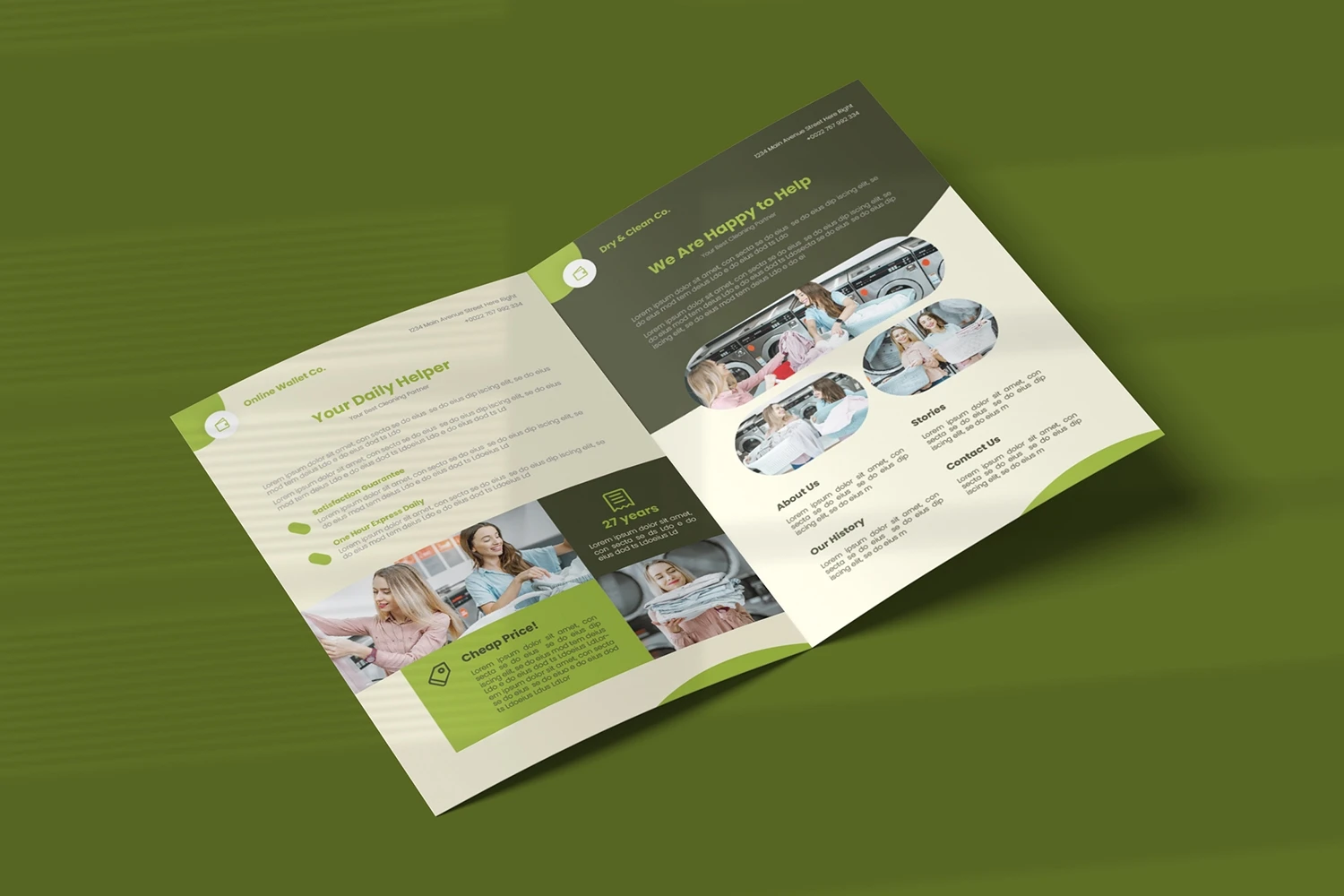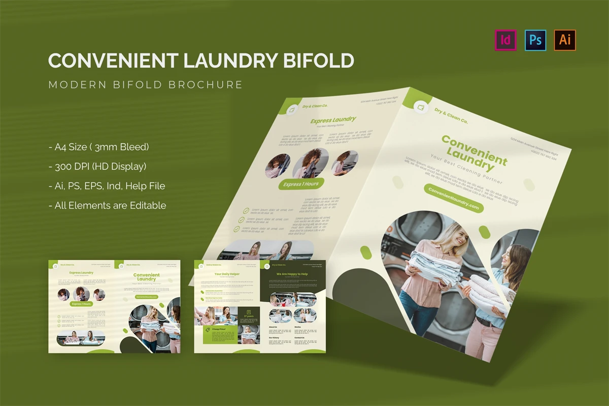 Convenient Laundry -- Bifold Brochure We present this Bifold Brochure for you, simple and very elegant, and this Bifold Brochure is suitable for all types of your business, made with Adobe InDesign (INDD), Adobe Photoshop (PSD) and Adobe Illustrator (AI), very easy to customize, Hope you Like it, dont forget to rate, Thanks.