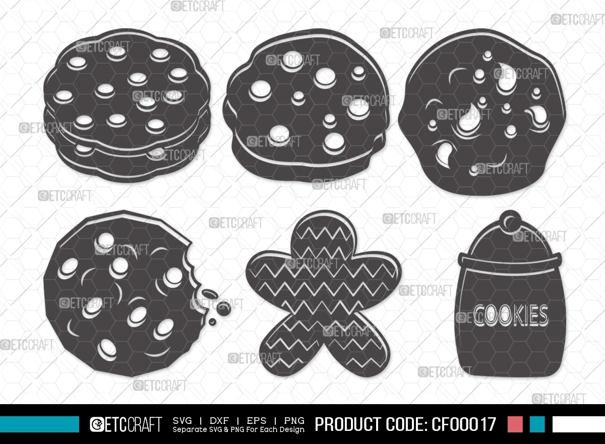 Unlock the sweetness of creativity with our Cookie Silhouette Pastry Biscuit Chocolate Chip Kitchen Bundle SVG Cut File. This digital design collection features a delightful range of cookie-themed silhouettes in versatile SVG, DXF, EPS, and PNG formats. Whether you're a baking enthusiast or a crafting connoisseur, this bundle offers endless creative opportunities to infuse a delectable touch into your projects.
