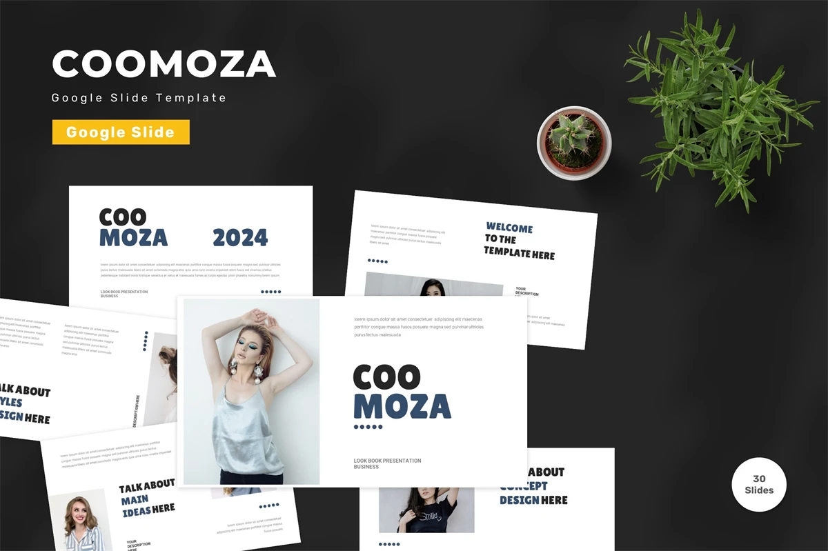 Get it now! **Coomoza - Google Slide Template** for All Business and Personal Needs All elements on this template are editable; input your content, replace your image with a placeholder, change the color, and all presentations include an animated slide to present your slides.