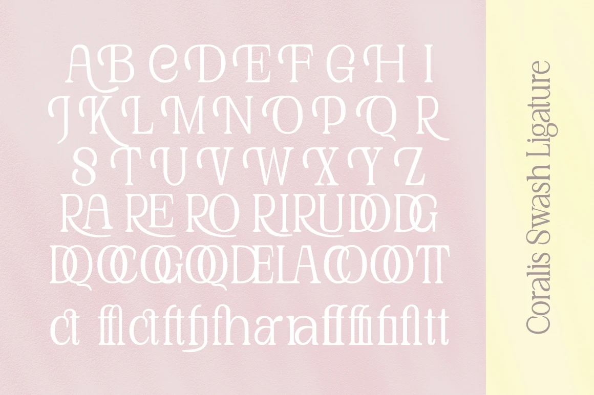 Available Fonts: . Coralis Elegant (OTF, TTF); . Multilingual. . SWASH. . Ligature. . Style Set.