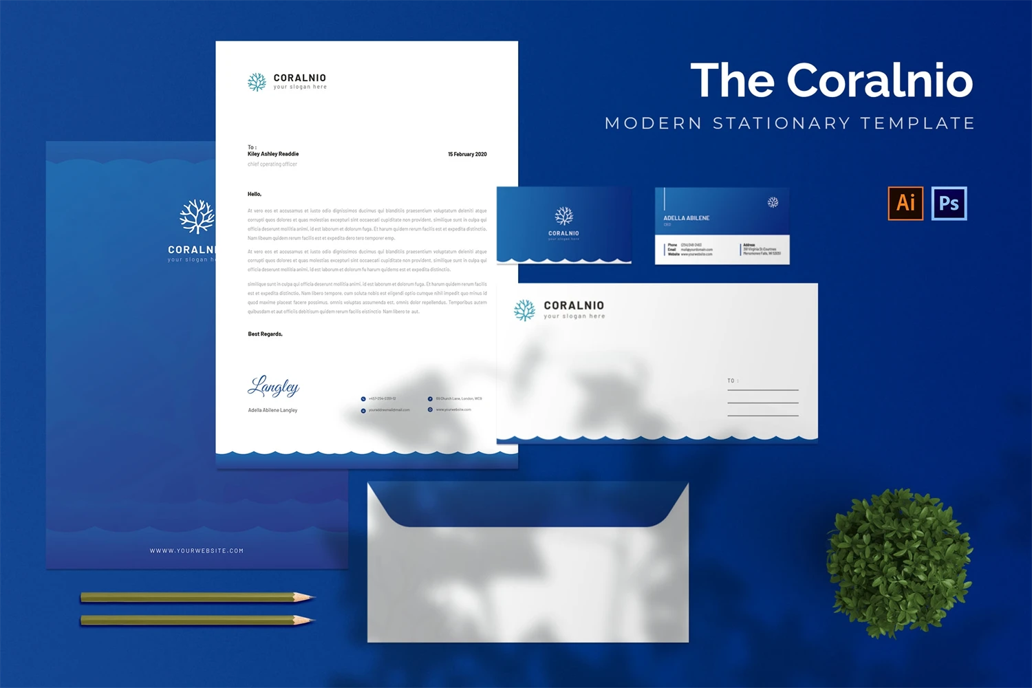 Coralnio - Stationary. This template is great for your business and this design will make your interested, elegant, and easily editable according to your needs. I hope you enjoy for this stationary.