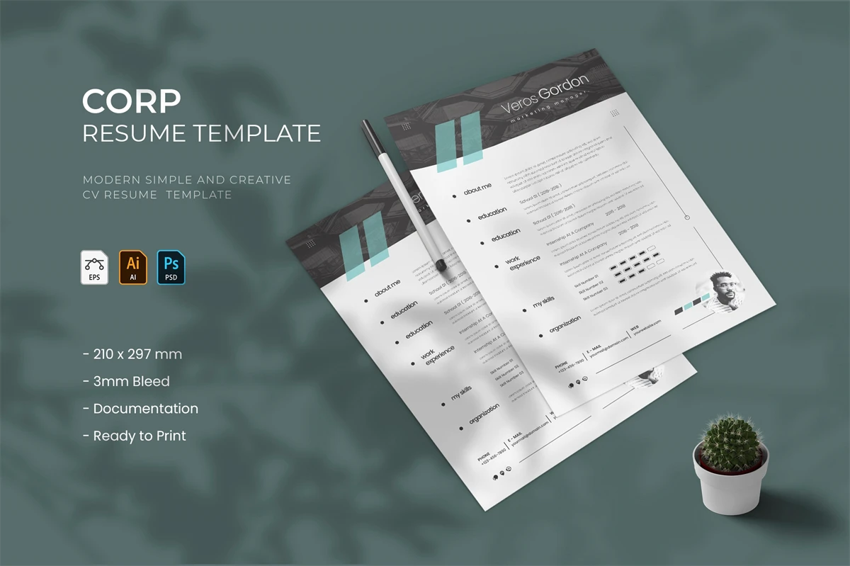 creative resume and cover letter template that will make your resume stand out from the hundreds of resumes employers get. It gives you the information you need, such as your name, contact information, social media links, education, experience, skills and interests. Also, it comes with three different color schemes.