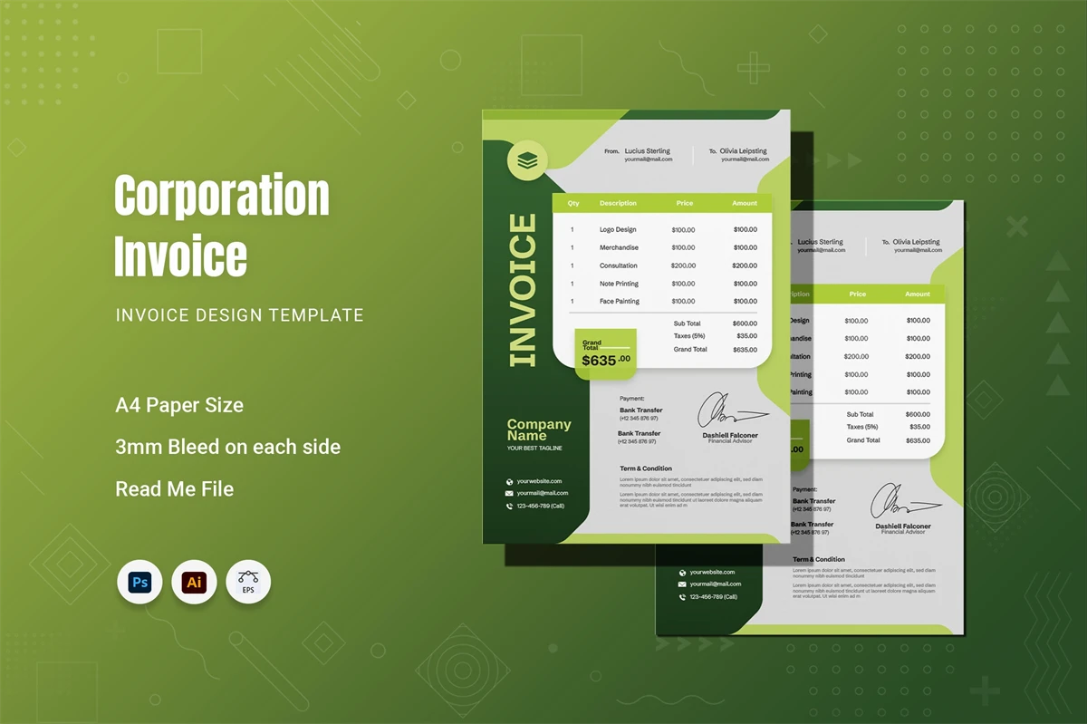 Each and every aspect holds significance within the realm of corporate affairs. Our invoice design template is poised to professionally showcase your brand. Your invoices will exude both style and practicality.