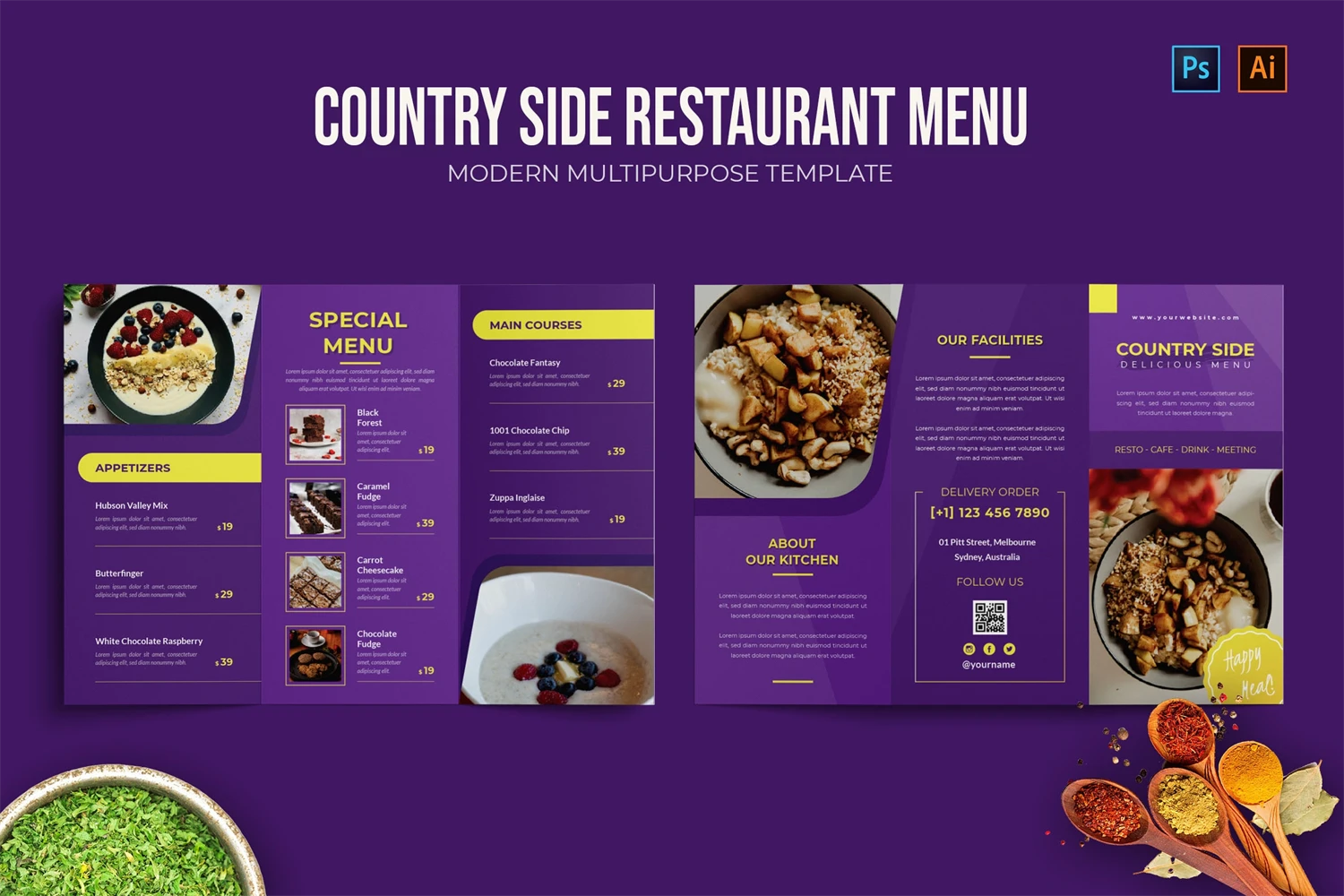 Country Side - Restaurant Menu. This template is great for your business and will make your customers interested, elegant, and easily editable according to your needs, this restaurant menu is perfect for, promos, cafes, hotels, resort shops online. etc. I hope you enjoy this restaurant menu