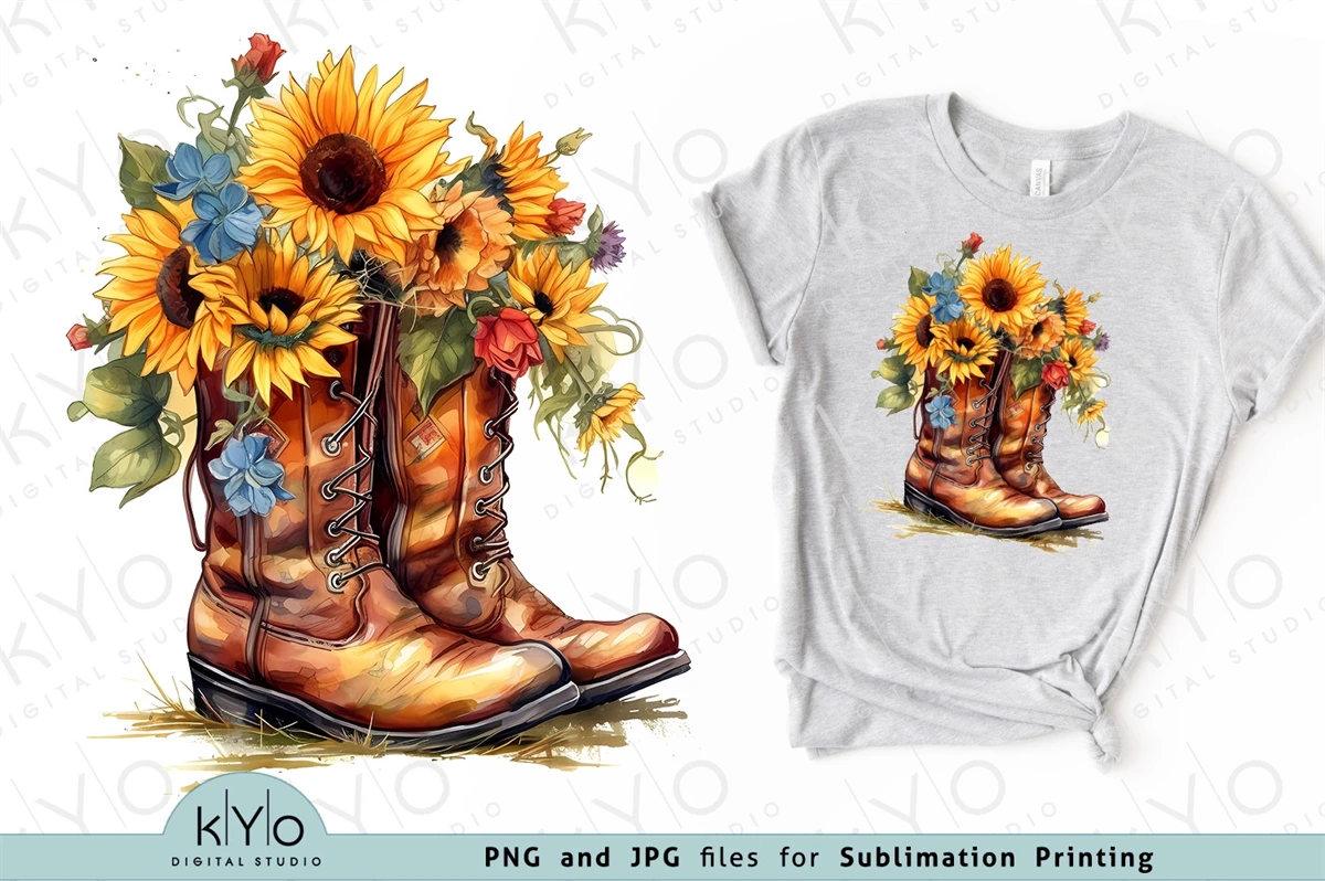 Watercolor Cowboy Boots Sunflowers Clipart Sublimation Design Download Png image files for Shirt Printing, Dtg Cowgirl Sublimation Png Ver-1