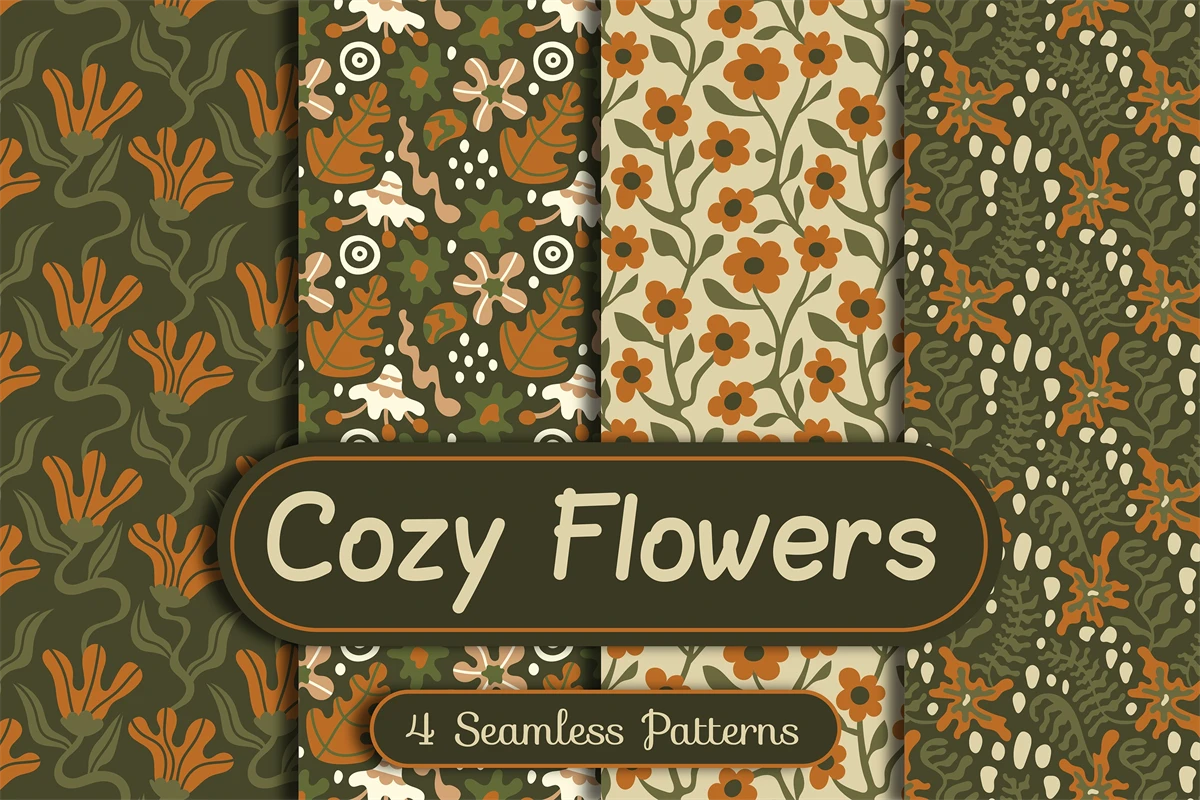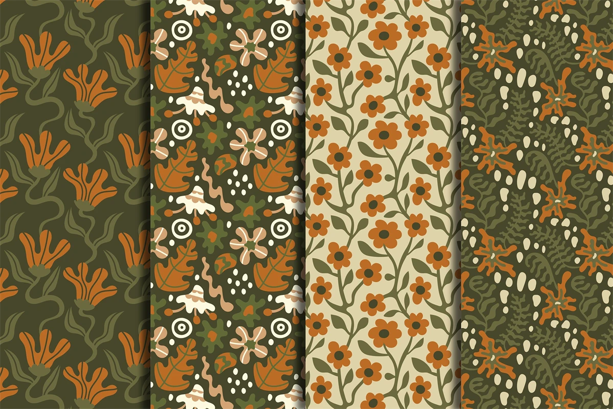 Modern Matisse inspired floral seamless patterns with wavy nature elements. Abstract botanical digital papers with liquid flower, leaves, dots and organic shapes. Cozy curvy endless backgrounds with contemporary plants. Decorative motif with meadow flowers. Trendy swirl pattern with fluid wildflowers. Repeat vector illustration.