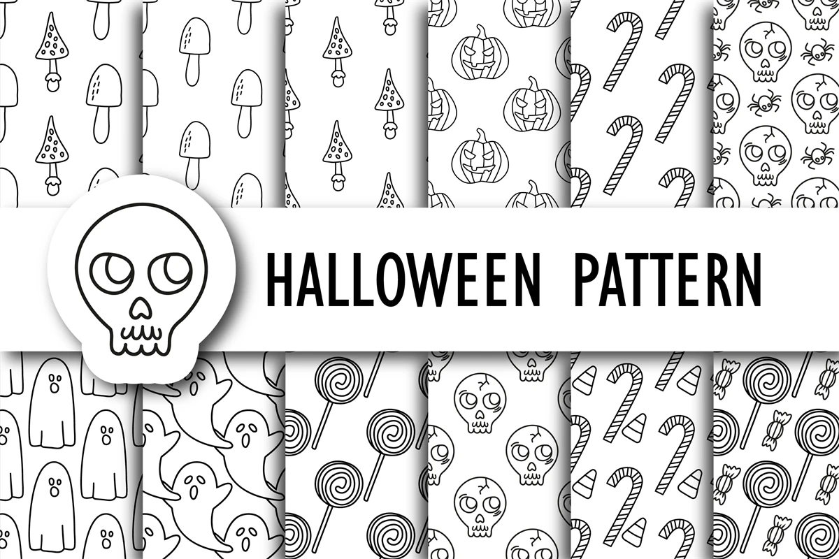 The Halloween collection digital paper, skull, ghosts, pumpkins, candies and lollipops. Paper for Halloween, for autumn invitations.