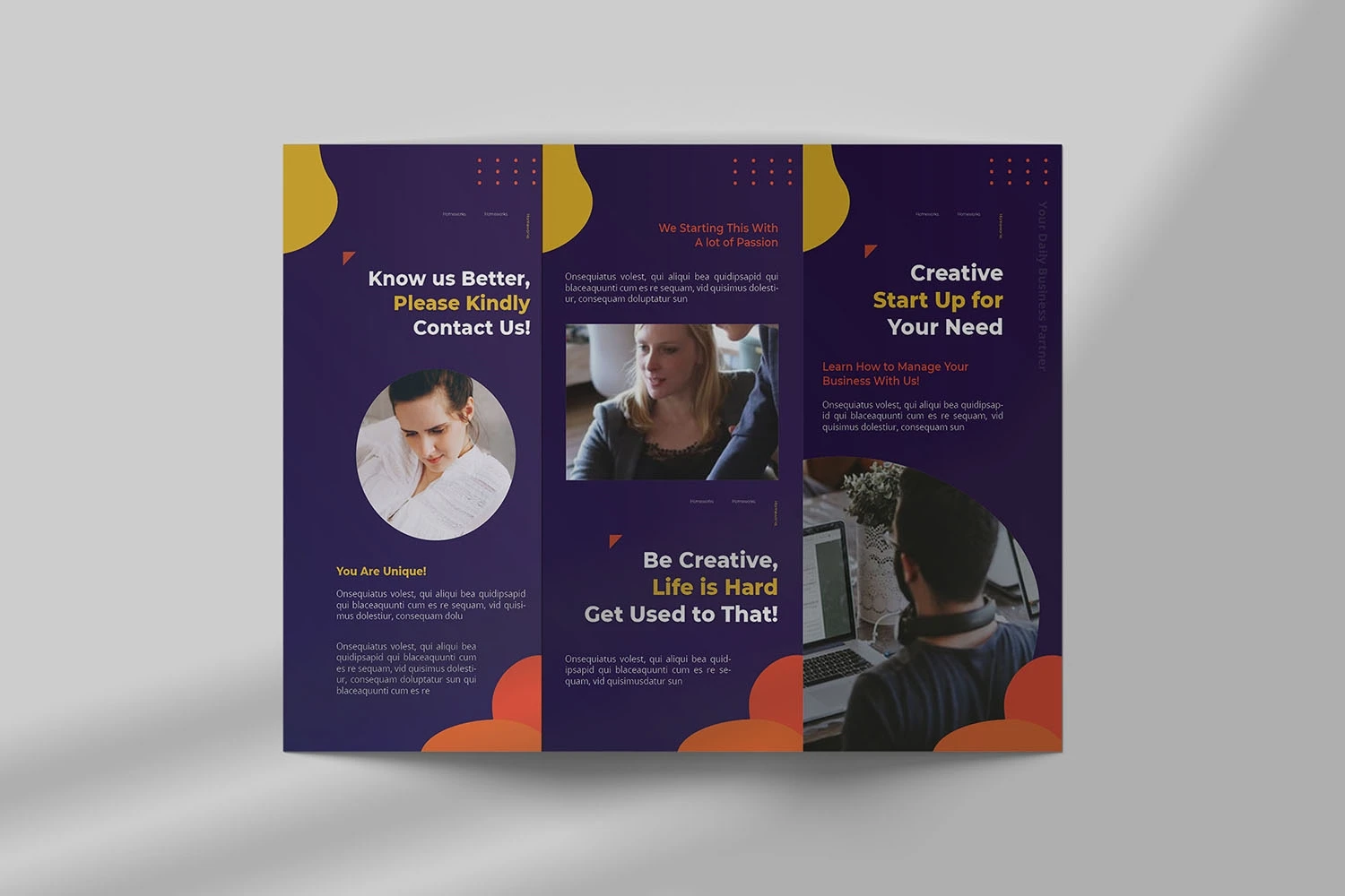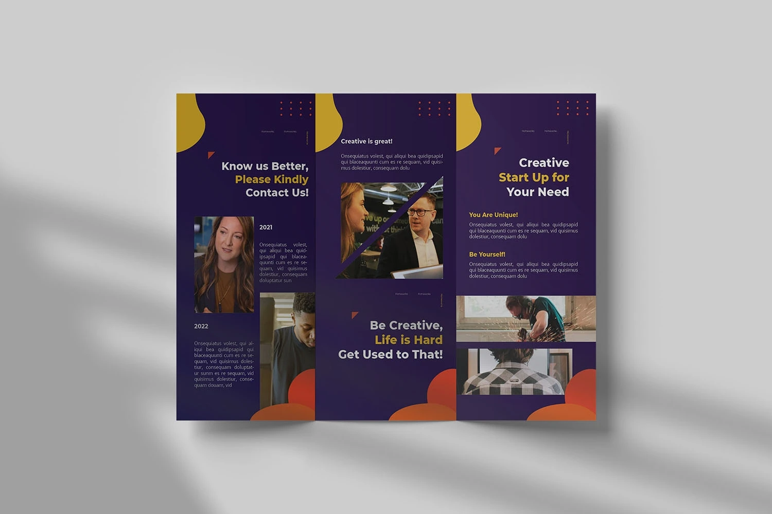 Creative Start Up - Trifold Brochure We present this Trifold Brochure for you, simple, very elegant and professional and this Trifold Brochure is suitable for all types of your business,company or corporate, made with adobe inDesign (indd), very easy to customize, Hope you Like it dont forget to rate, Thanks You.