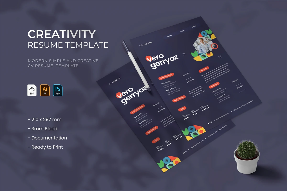 creative resume and cover letter template that will make your resume stand out from the hundreds of resumes employers get. It gives you the information you need, such as your name, contact information, social media links, education, experience, skills and interests. Also, it comes with three different color schemes.