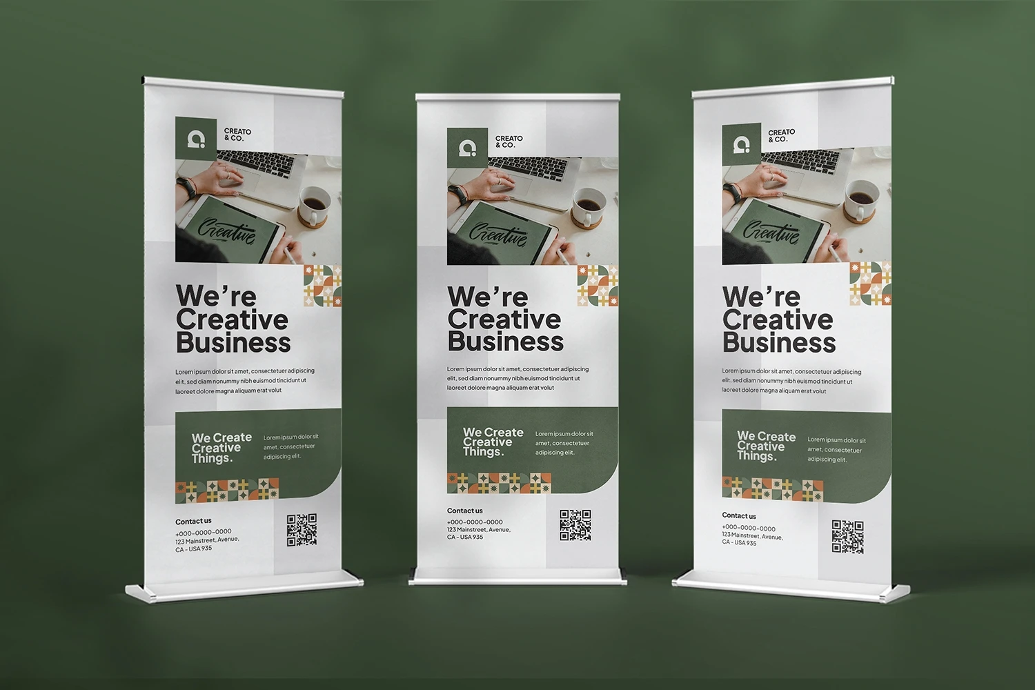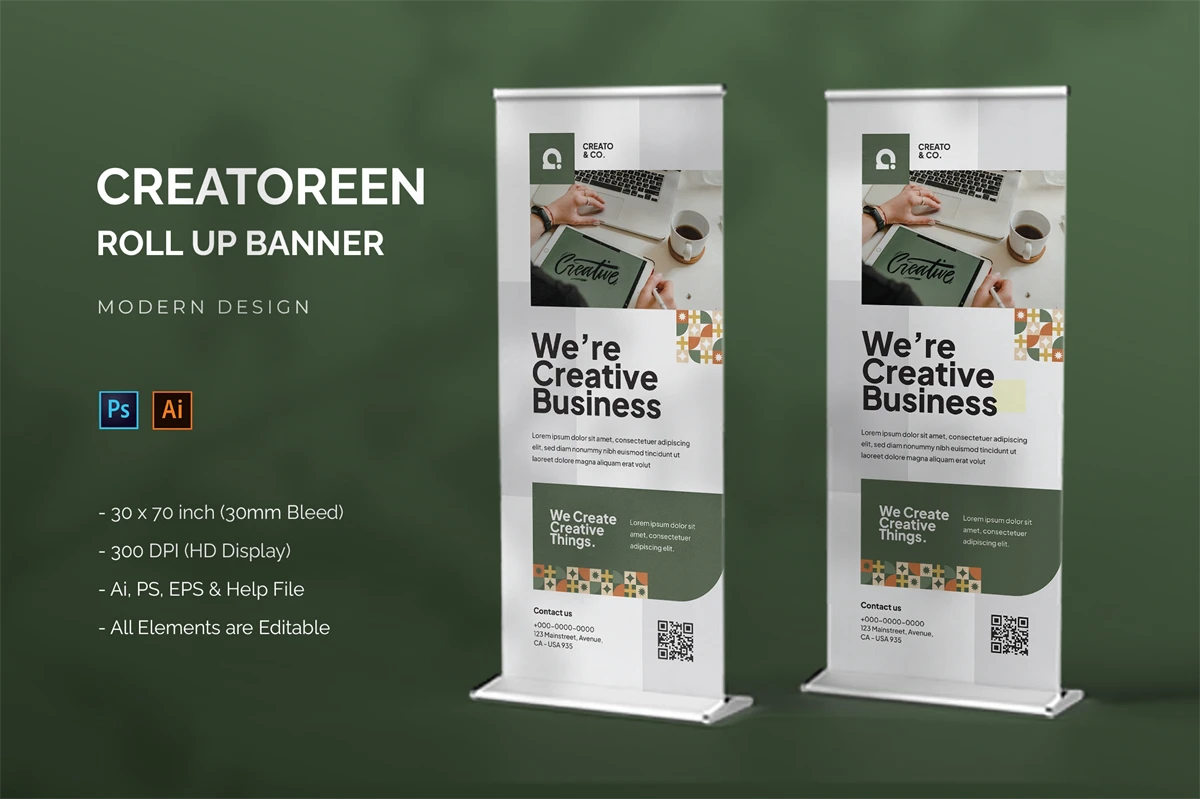 This is **Creatoreen - Roll Up Banner** Don't wait, get it right now! , All Your Roll-Up Banner Needs, Professional or Personal. This stylish and adaptable template is perfect for your company's promotional materials.