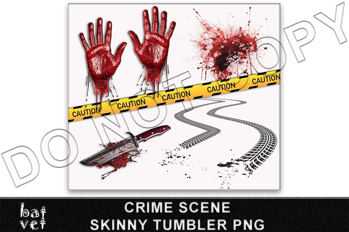 Crime Scene Skinny Wrap, Bloody Hands, Bloody Knife, Tire Tracks, Blood Splatter, Caution Tape Sublimation Print Design.
