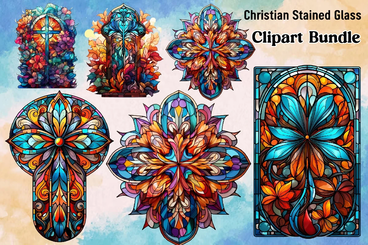 Watercolor Cross Stained Glass Clipart PNG Bundle
