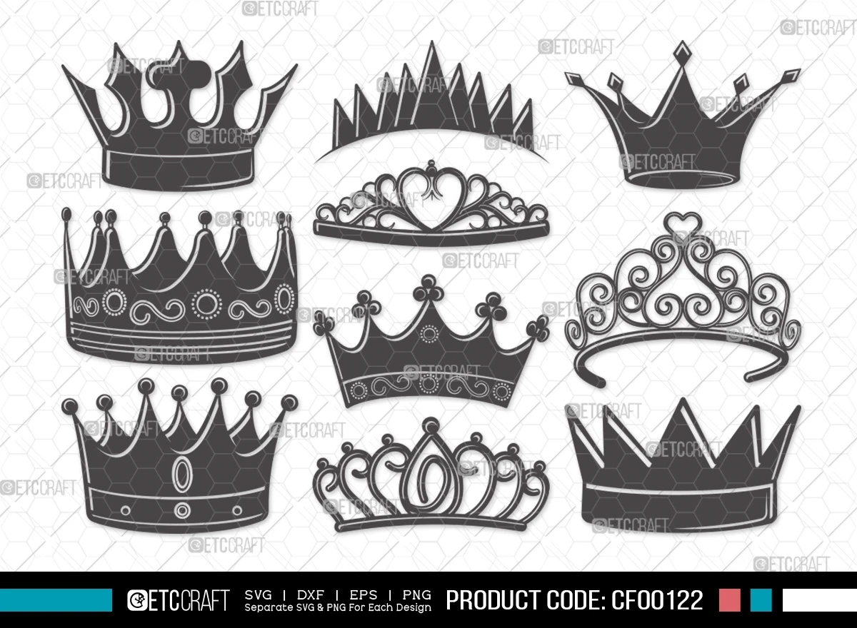 Step into the world of royalty with our Crown Silhouette King Queen Tiara SVG Cut File Bundle. This collection features finely crafted crown silhouettes, perfect for kings, queens, princes, and princesses. Elevate your creative projects with these regal designs, adding an air of elegance and sophistication. Embrace the essence of royalty and infuse a touch of grandeur into your crafts with these majestic crown silhouettes.