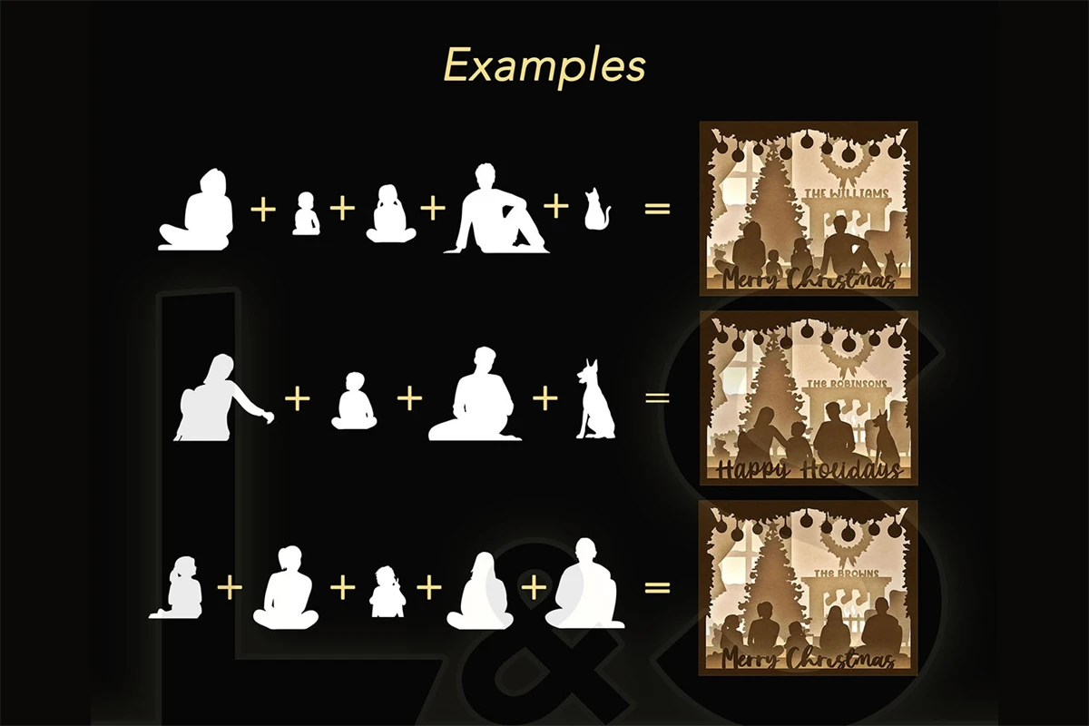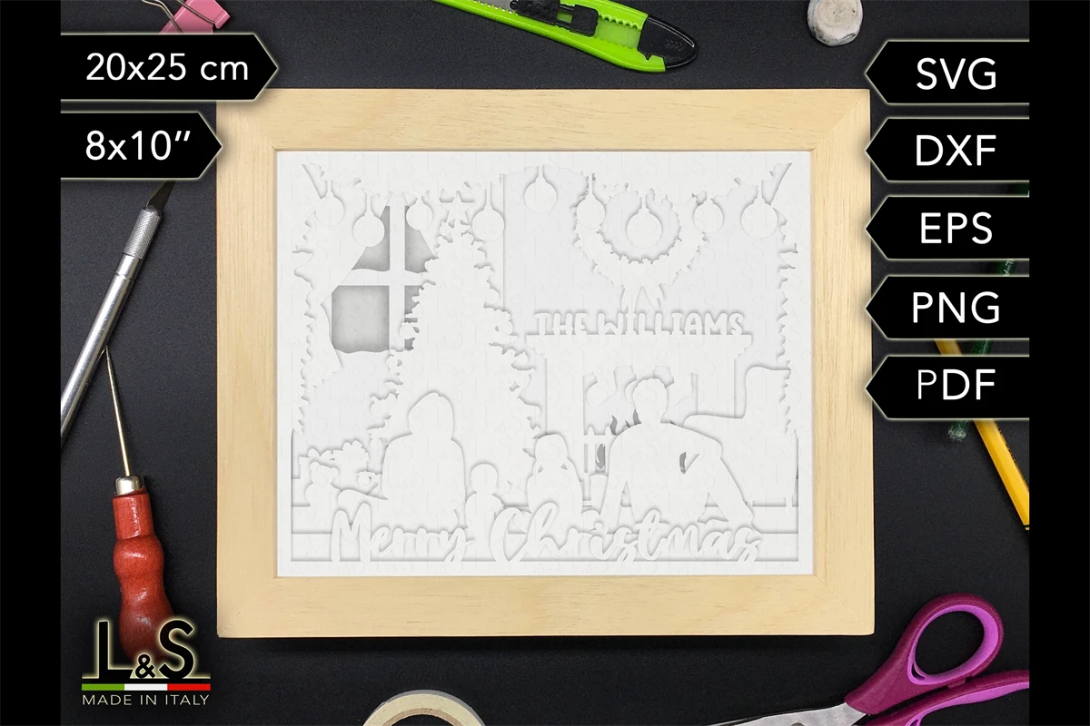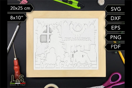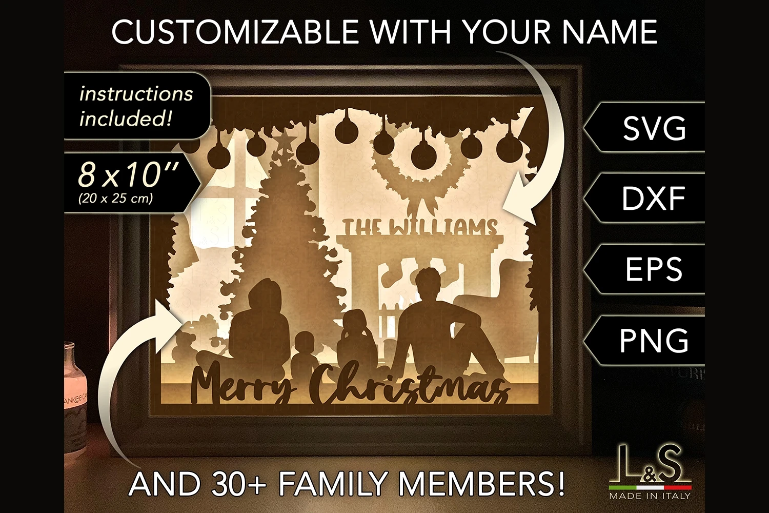 Download this 8x10'' Customizable Christmas Family Shadow Box SVG File with family name and 36 different family members and create a unique paper cut Light Box in just a few minutes!