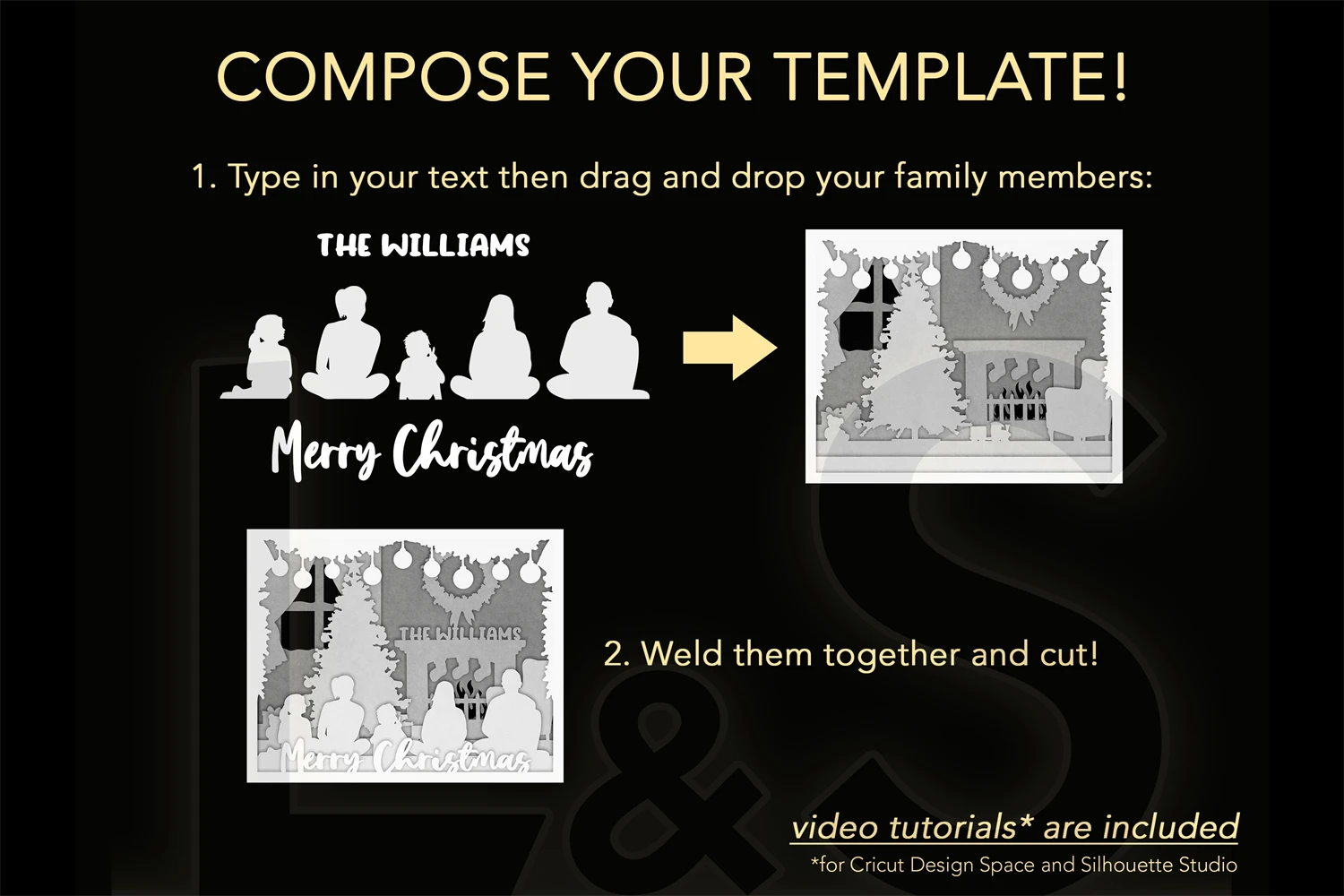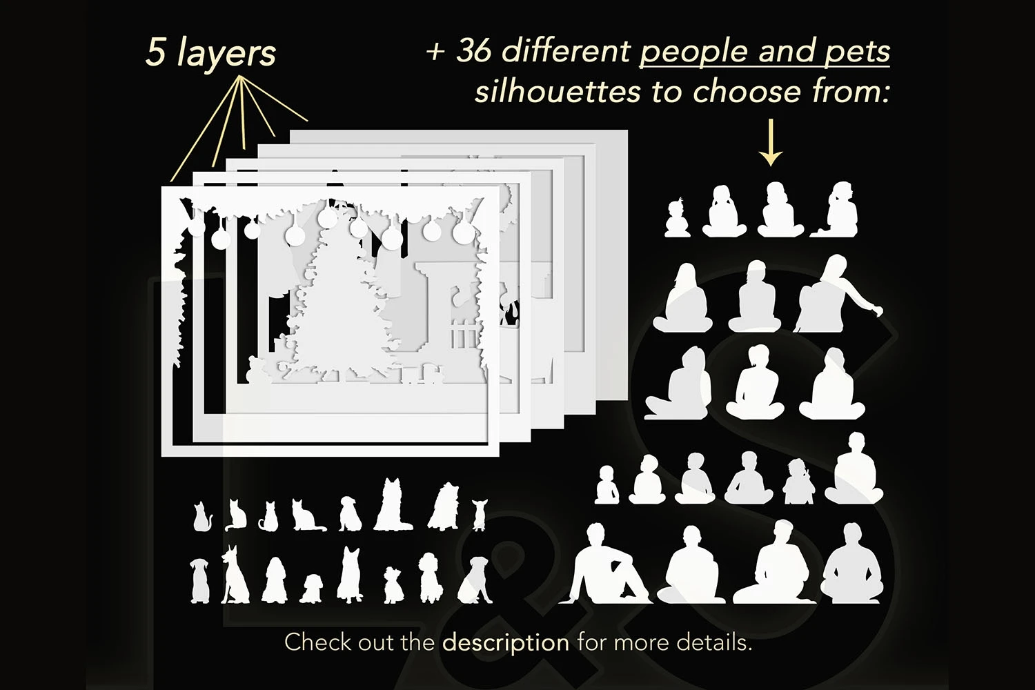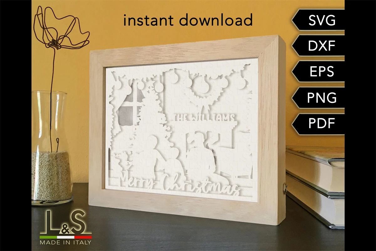 Download this 8x10'' Customizable Christmas Family Shadow Box SVG File with family name and 36 different family members and create a unique paper cut Light Box in just a few minutes!