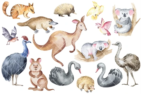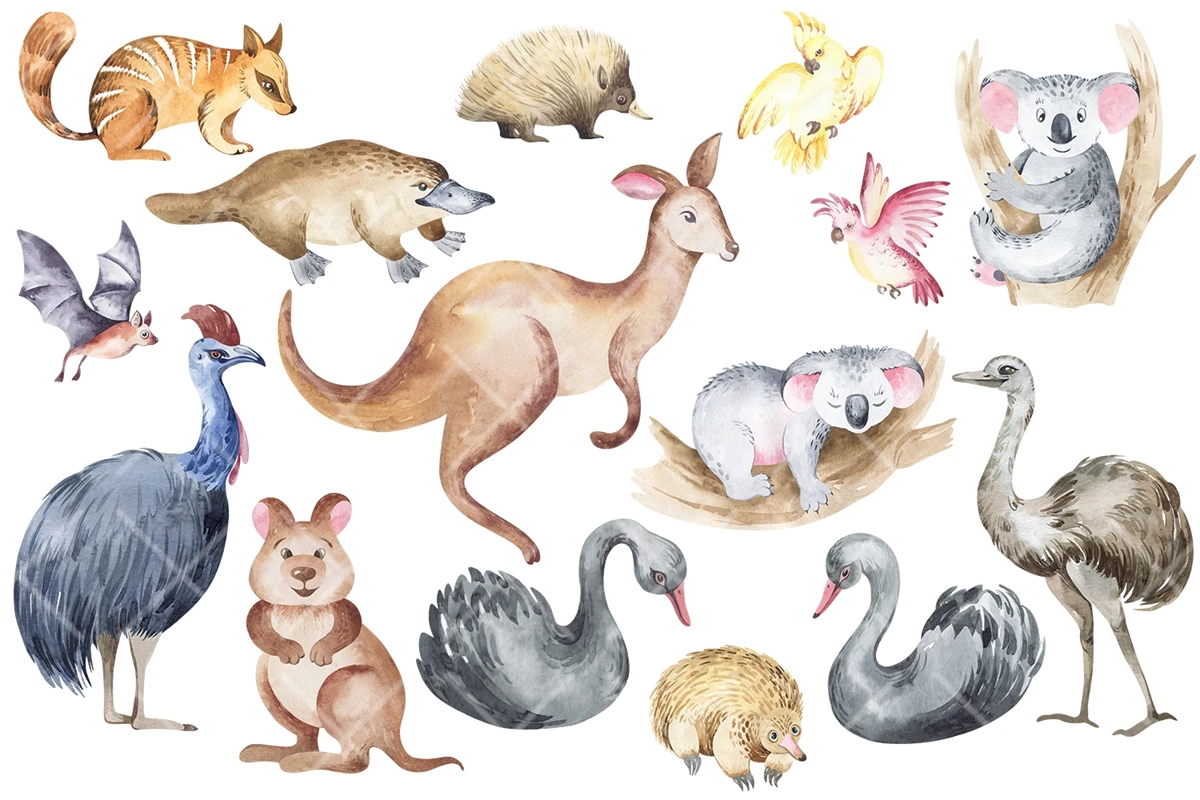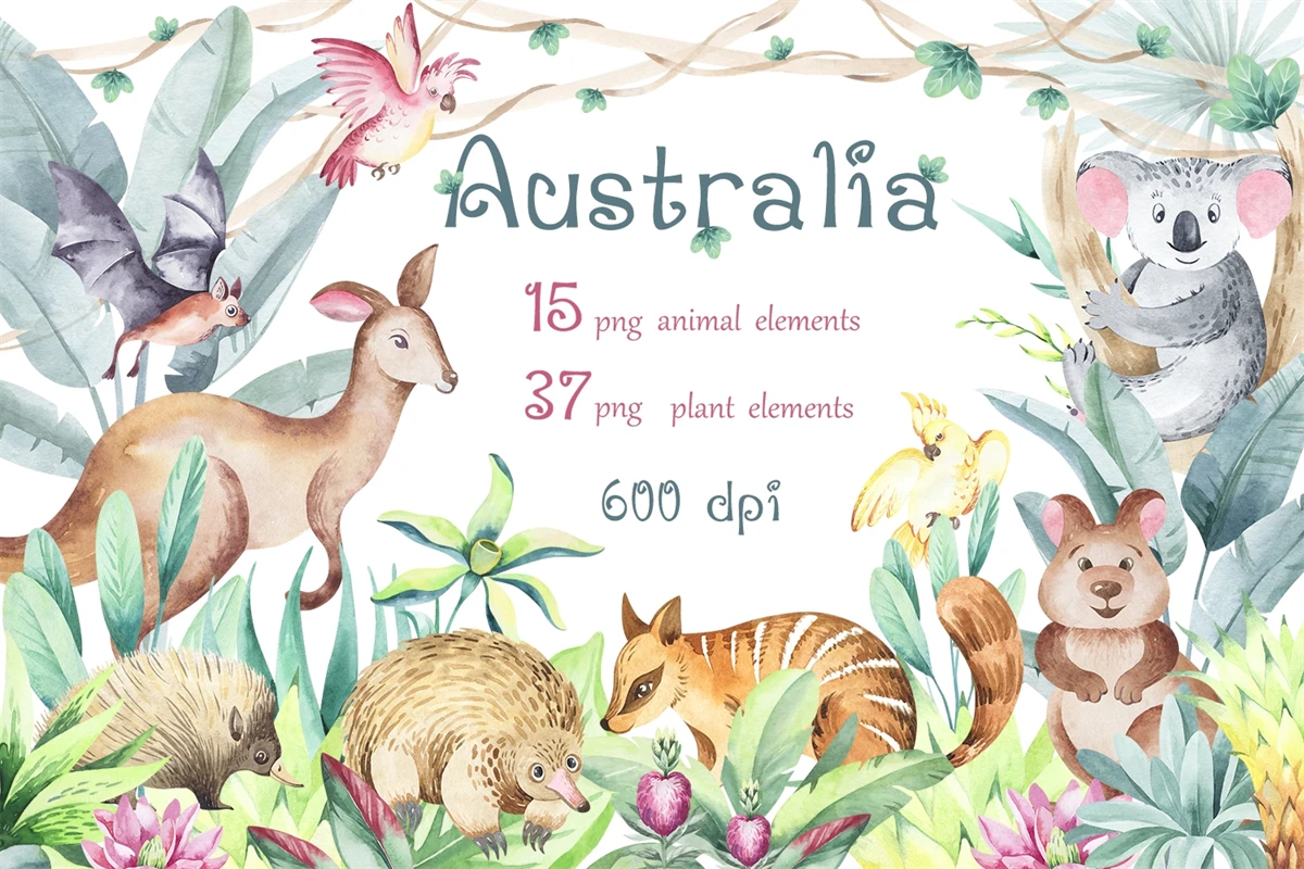 This is a quality children's clipart of watercolor individual elements. Bright colors, plants and animals of Australia. Made in watercolor technique. Perfect design for kids crafts, greeting cards, apparel, blogs, posters, decor, sublimation and more.