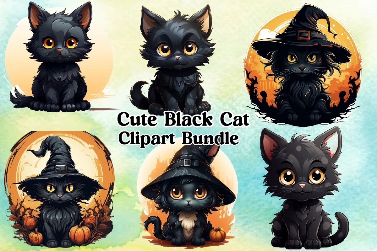 Watercolor Cute Black Cat Clipart PNG Bundle