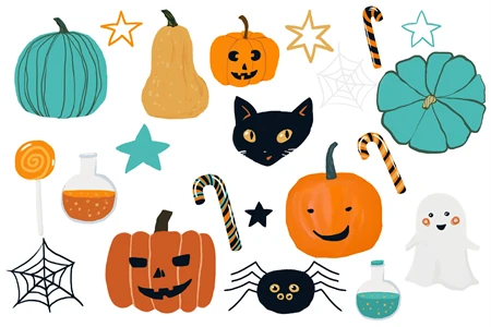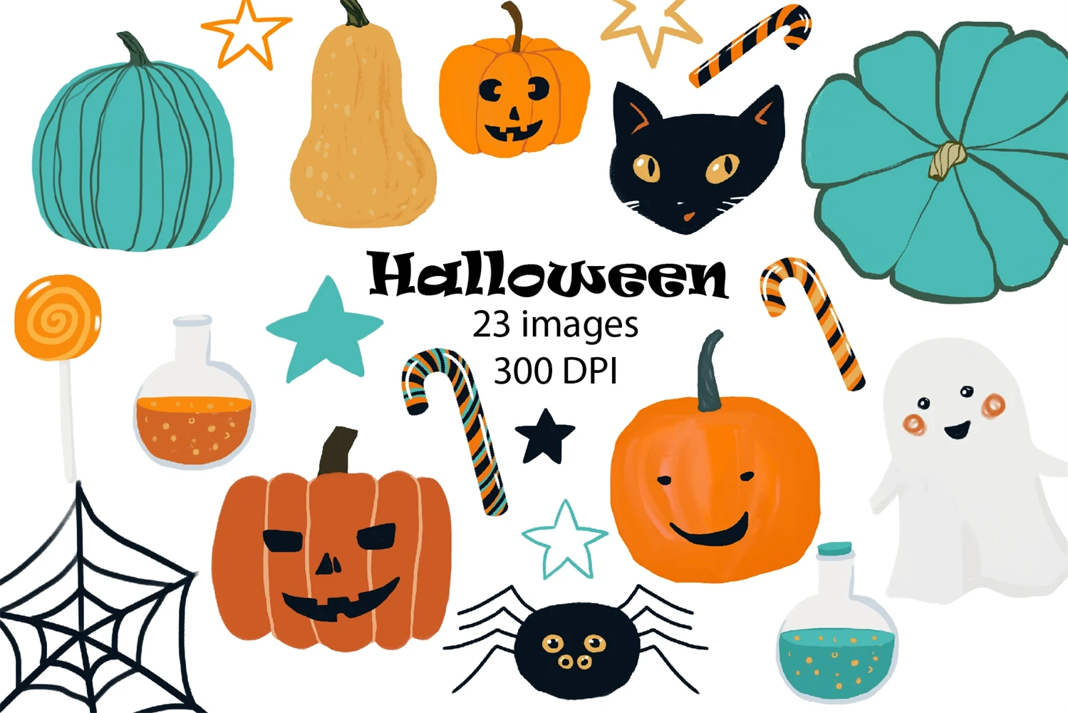 Set of digital modern bright color Fun fall pumpkins clipart, ghost, cat, Jack O Lantern, sweets for girls, boys, babys nursery, childrens rooms, scrapbooking, cards. Unique cute PNG illustrations with transparent background for creating your projects: cards, invitations, greetings and more.