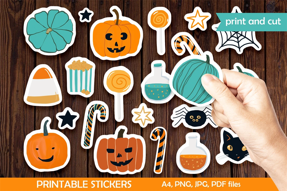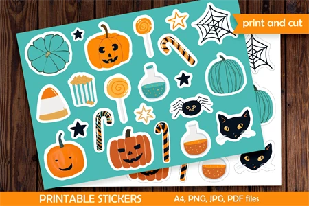 Adorable Cartoon Halloween Sticker Pack for printing. In this delightful sticker pack, you'll find an assortment of cute and charming Halloween-themed illustrations. Each sticker features a unique character or spooky motif, perfect for adding some festive flair to your chats and messages. Whether you want to express Halloween greetings, share your love for the holiday, or simply add some playful fun to your conversations, this sticker pack has got you covered. Get ready to bring a touch of cuteness to your Halloween celebrations with these adorable cartoon stickers!