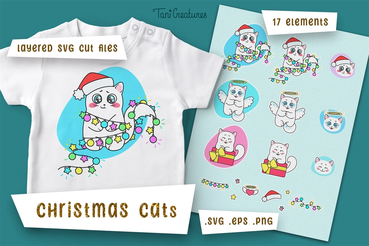 Cute and funny vector illustrations of white Cats on Holidays: Cat with Holidays Lights, Cat Angel and Cat with gift box! Ready to use in SVG cut file, PNG and EPS file formats for your projects! Create a wonderful mood at this magical time!