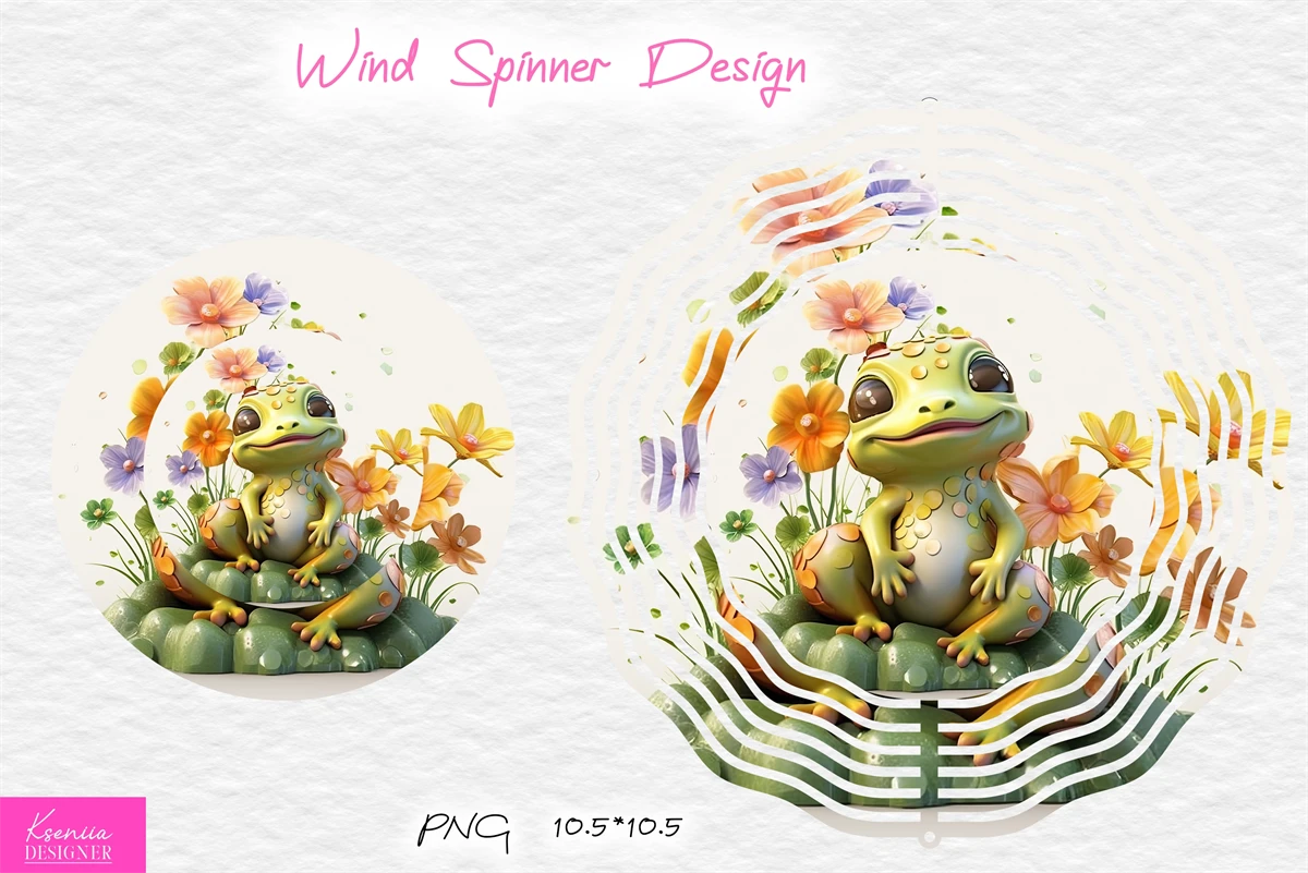Cute Green Frog Wind Spinner Sublimation Flowers Design