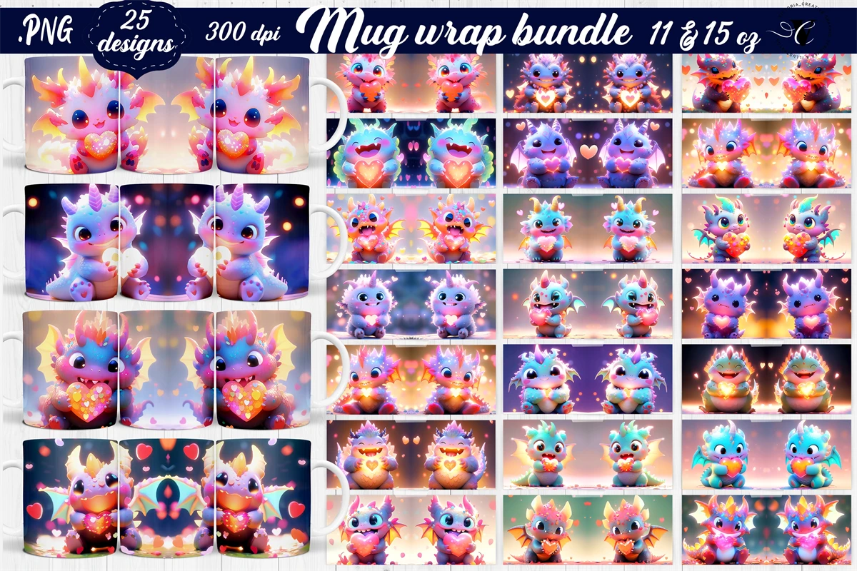Cute monsters mug wrap bundle with little dragon and bright heart, Mag sublimation bundle