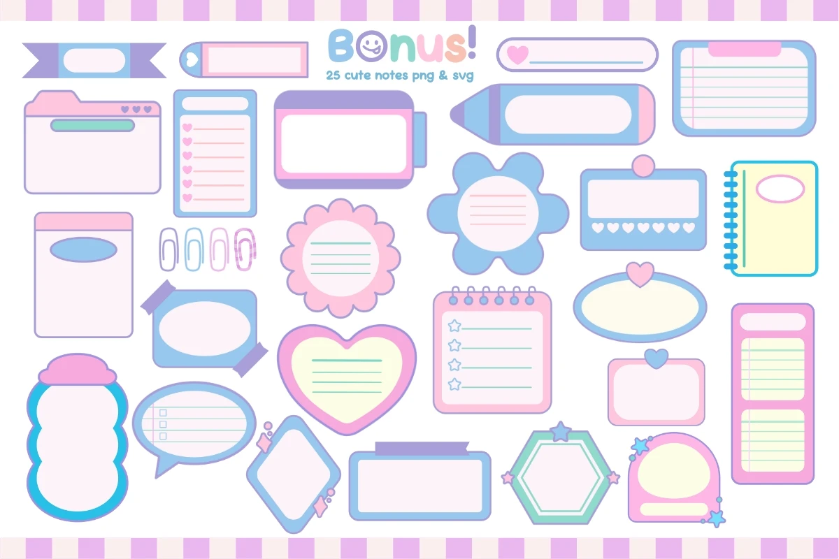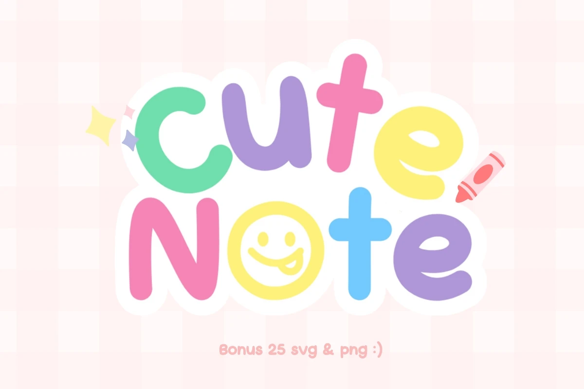 Cute Note is a cute and playful display font that brings a playful feel to your designs, complete with a cute smiley face gimmick. This font is perfect for a variety of design projects, including notes, logos, quotes, greeting cards, posters, t-shirts, and much more. Plus, as a special bonus, youll receive 25 cute note PNG and SVG files that can be used for decorating or creating memo notes.