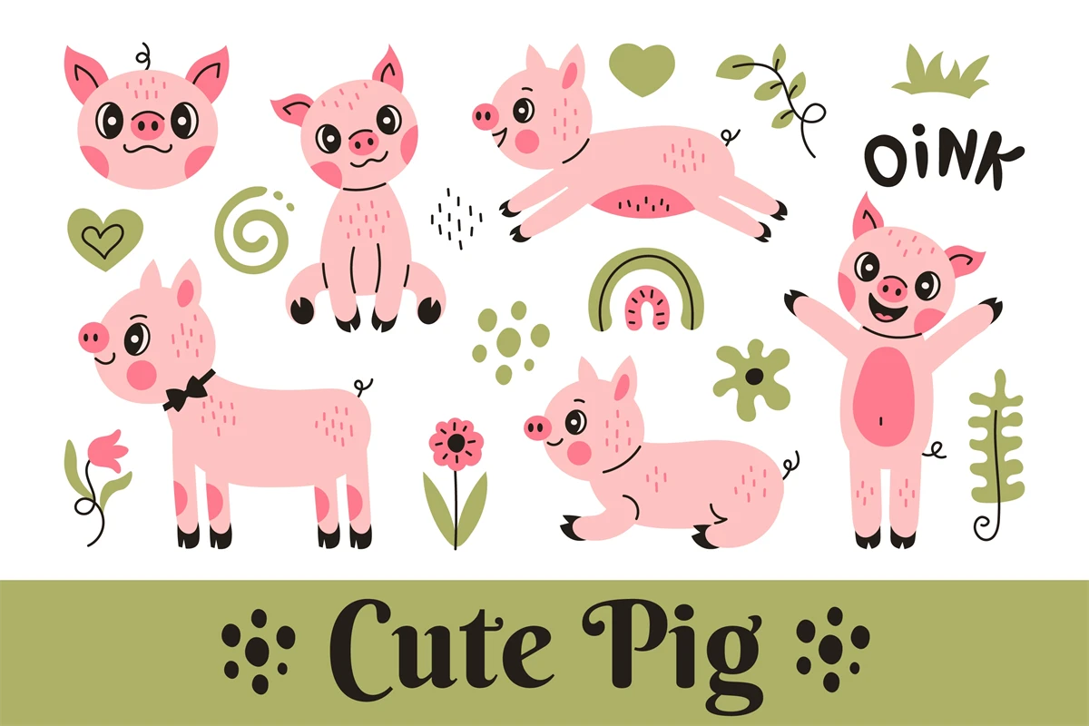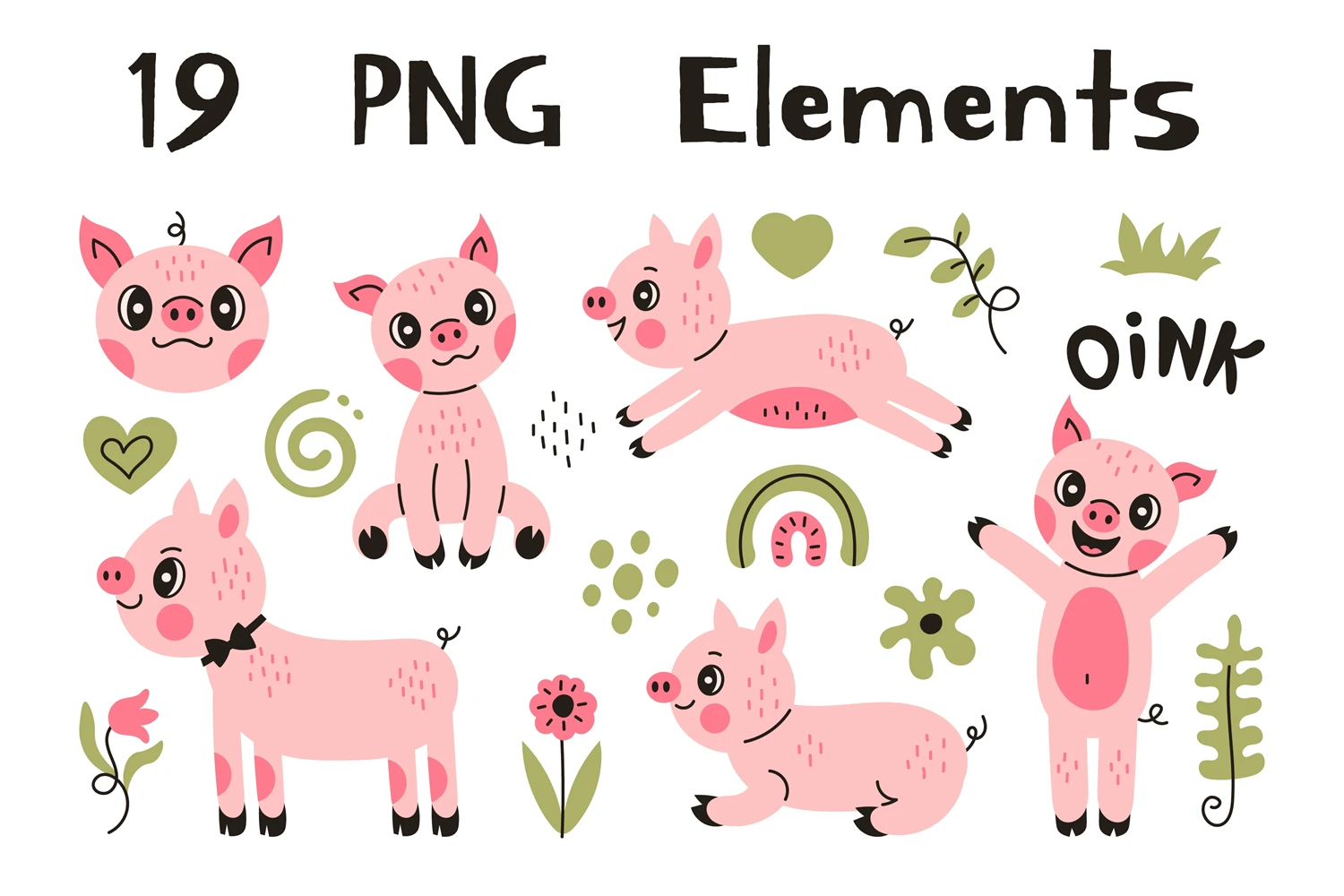 Cute pig PNG Clipart. Funny piglet with natural elements in flat and doodle Scandinavian style. Animal character with rainbow, flower, leaf, heart, dots and other organic shapes. Childish farm animal art. Vector illustration.