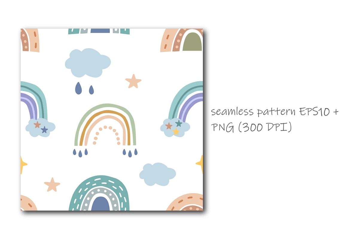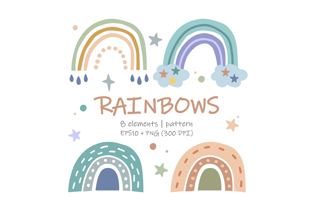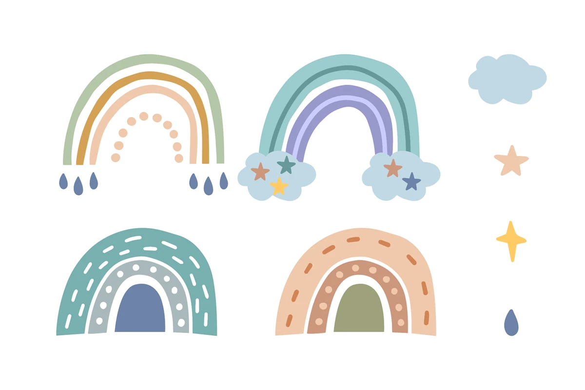 Vector collection of high quality colorful rainbows, cloud, stars cliparts. Hand drawn modern prints in trendy Scandinavian, Boho style. Funny, cute, hygge, doodle illustration and pattern for poster, banner, print, baby shower invites, textile, decoration kids playroom or greeting card.