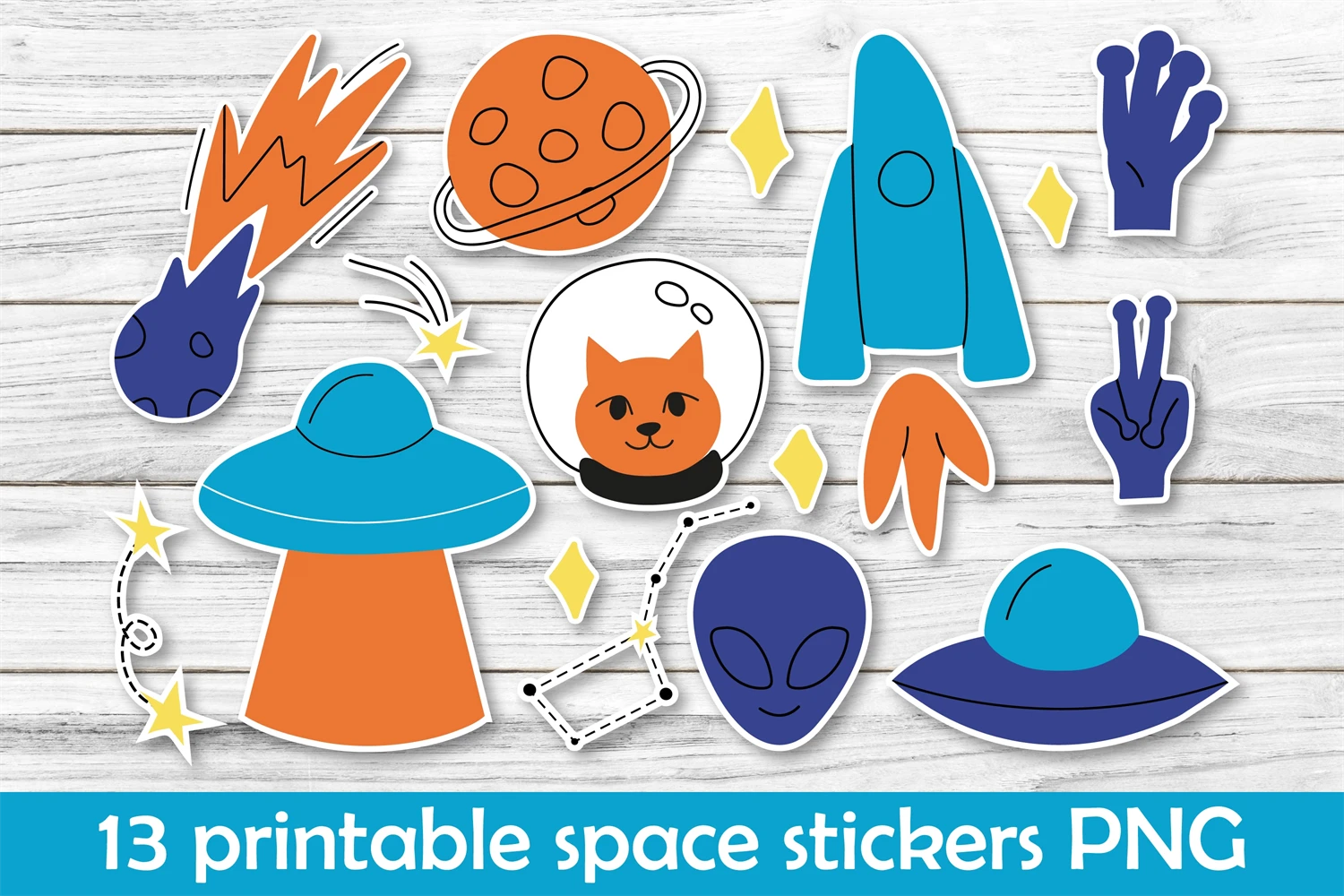 Do you love astronomy and science fiction? Here we have cute illustrations of cat astronaut, rocket, ringed planet and an UFO.