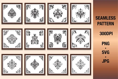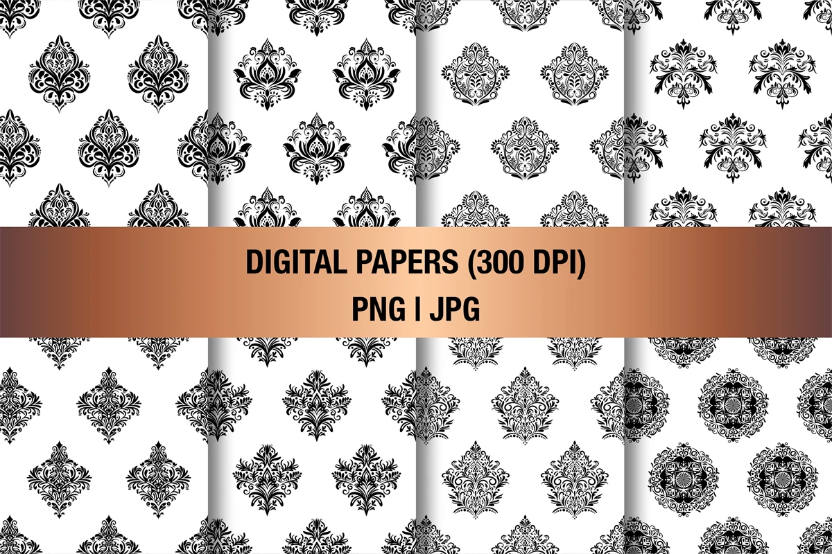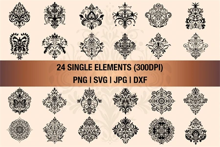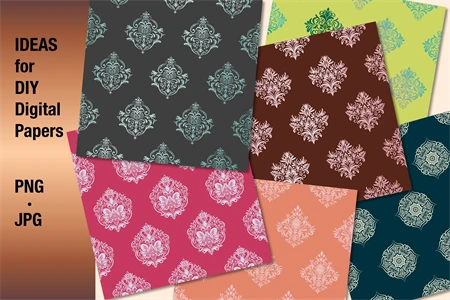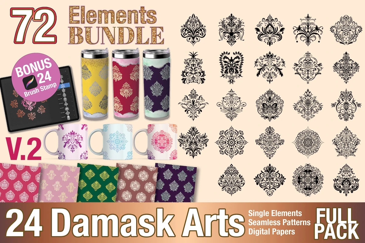 Damask bundle contains 72 elements with single damasks, patterns, and seamless digital papers.