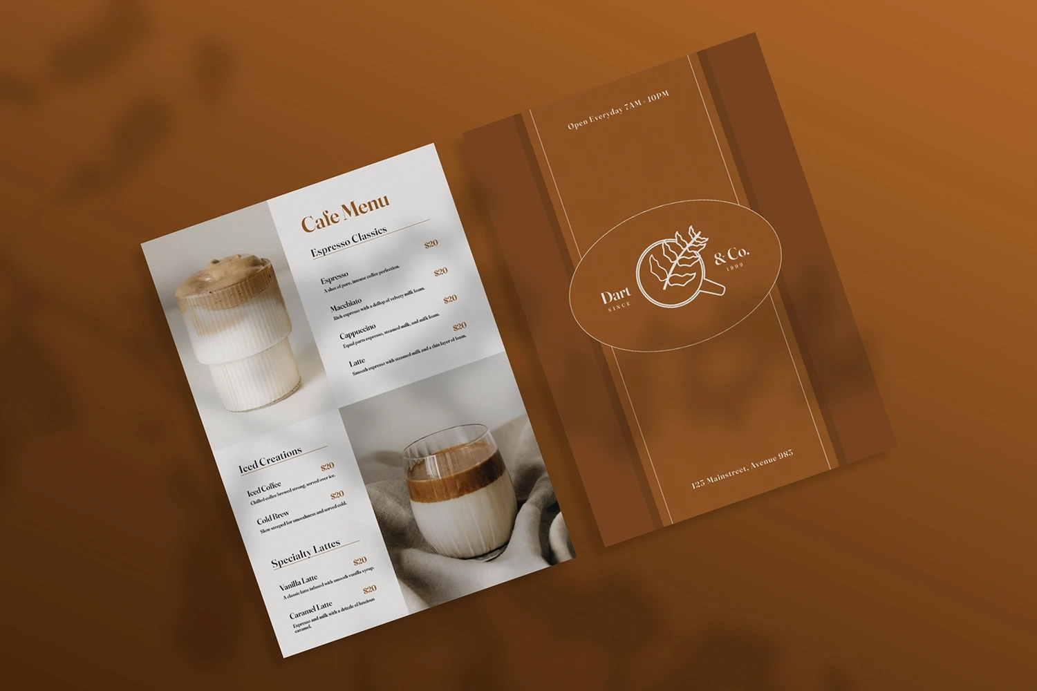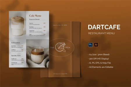 **Dartcafe - Restaurant Menu**. This template is excellent for your business and will make your customers interested, elegant, and easily editable according to your needs, this restaurant menu is perfect for, promos, cafes, hotels, and resort shops online. etc. I hope you enjoy this restaurant's menu