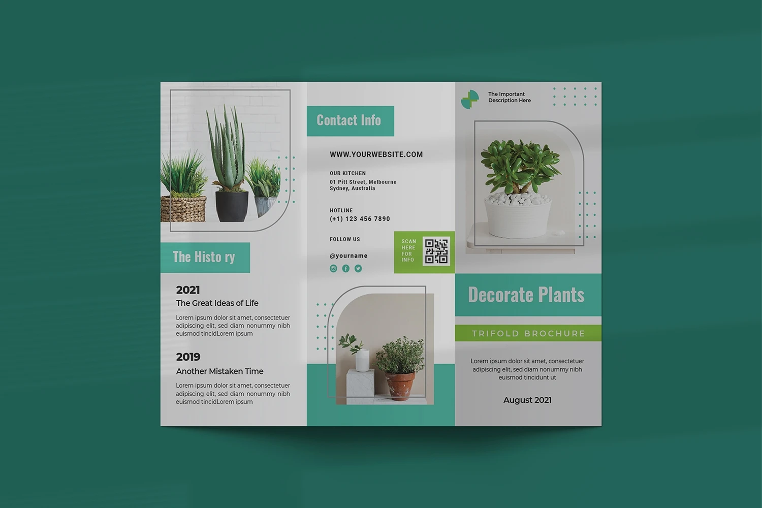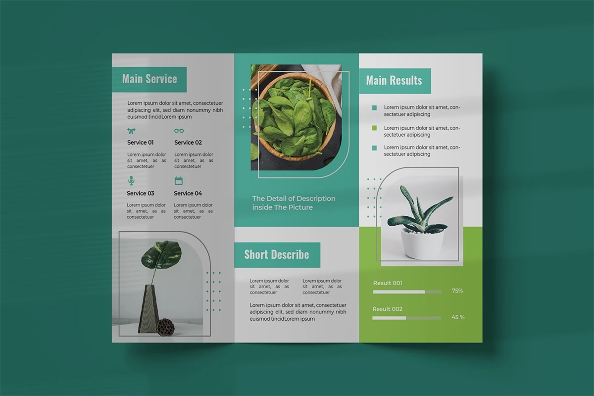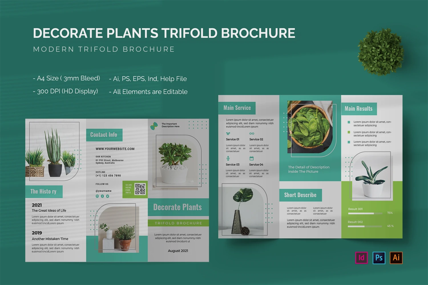 Decorate Plants - Trifold Brochure We present this Trifold Brochure for you, simple, very elegant and professional and this Trifold Brochure is suitable for all types of your business,company or corporate, made with Adobe InDesign (INDD), Adobe Photoshop (PSD) and Adobe Illustrator (AI), very easy to customize, Hope you Like it dont forget to rate, Thanks You.