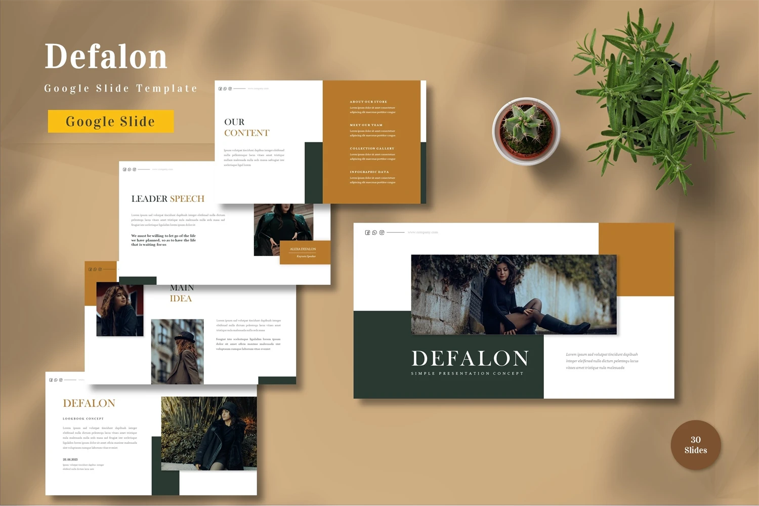 Get it now! **Defalon - Google Slide Template** for All Business and Personal Needs All elements on this template are editable; input your content, replace your image with a placeholder, change the color, and all presentations include an animated slide to present your slides.