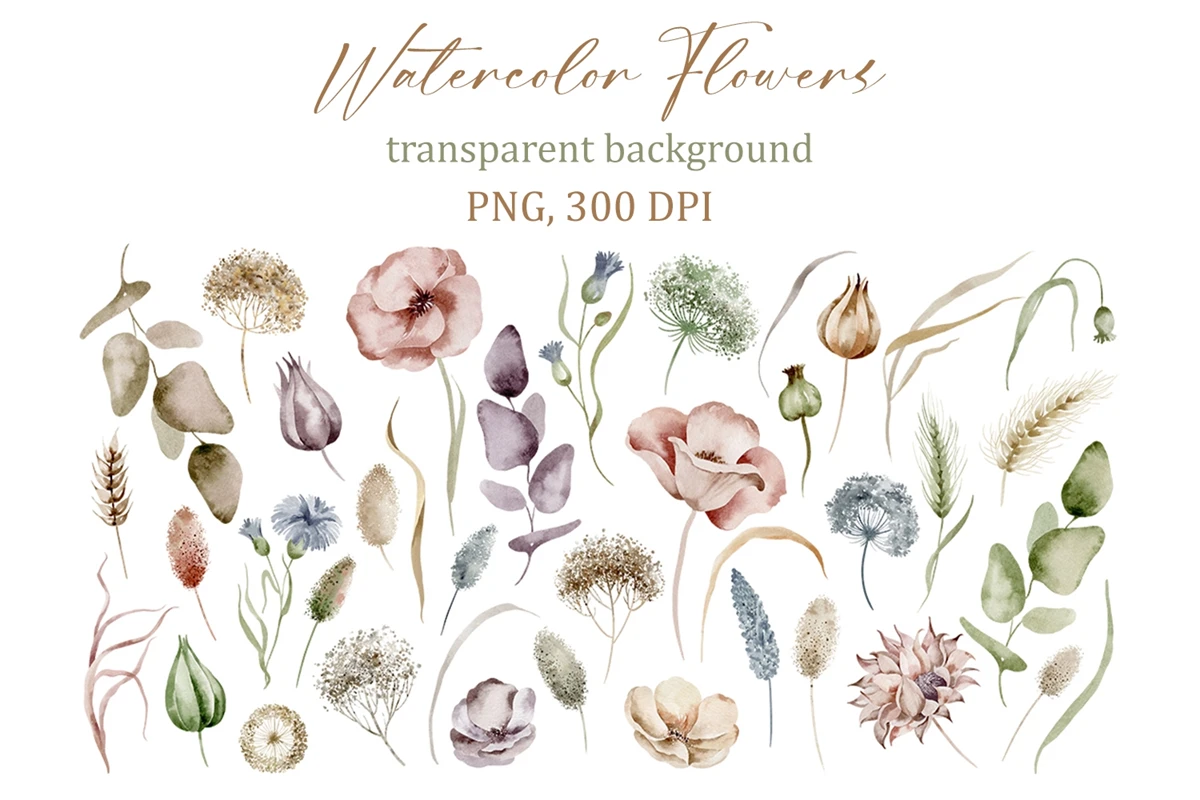 This set of delicate watercolor flowers and leaves is perfect for adding a touch of nature to your creative projects. The flowers and leaves are painted in a soft and elegant style, with transparent backgrounds that make them easy to layer and use.