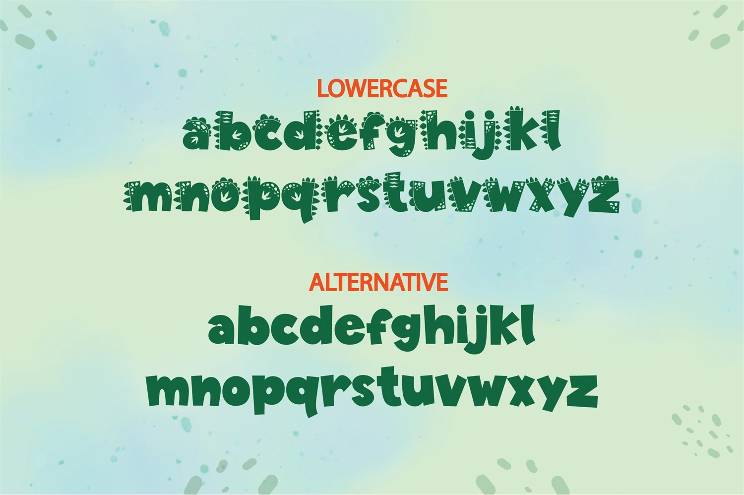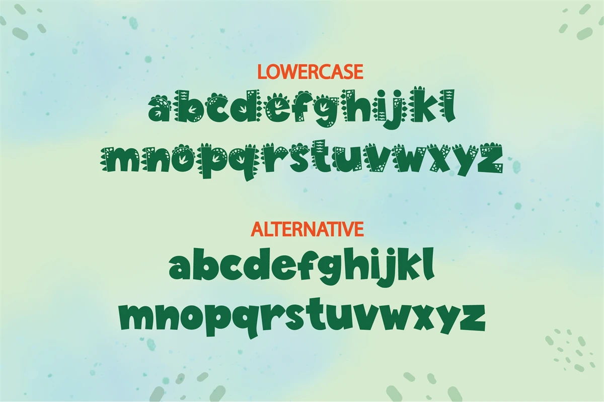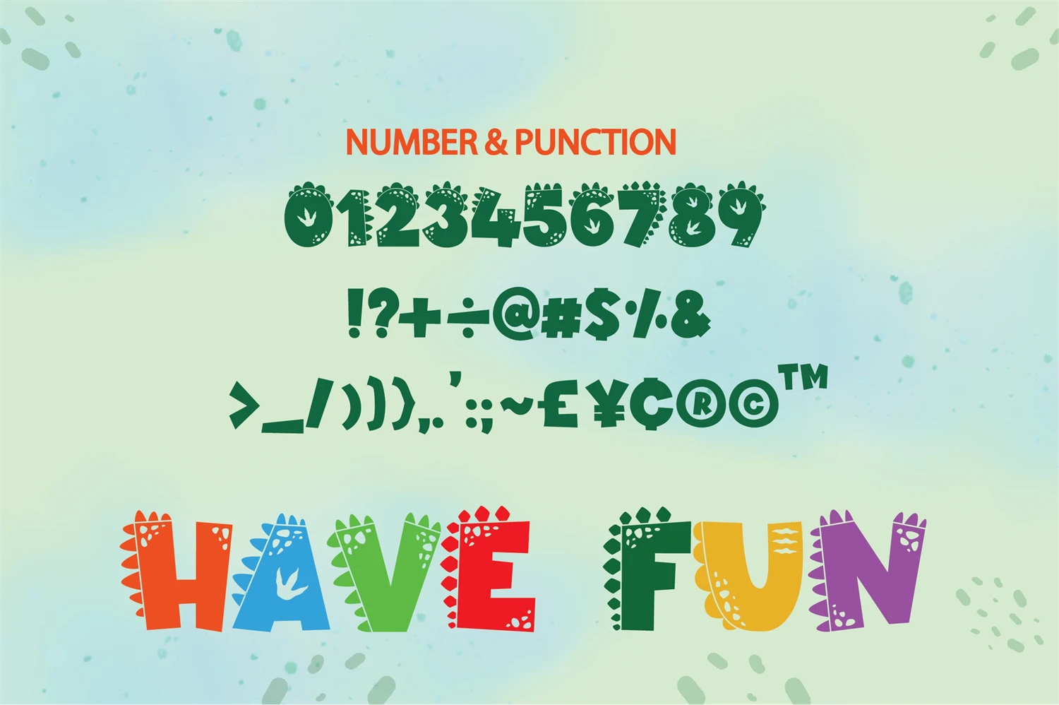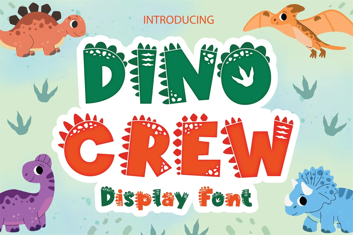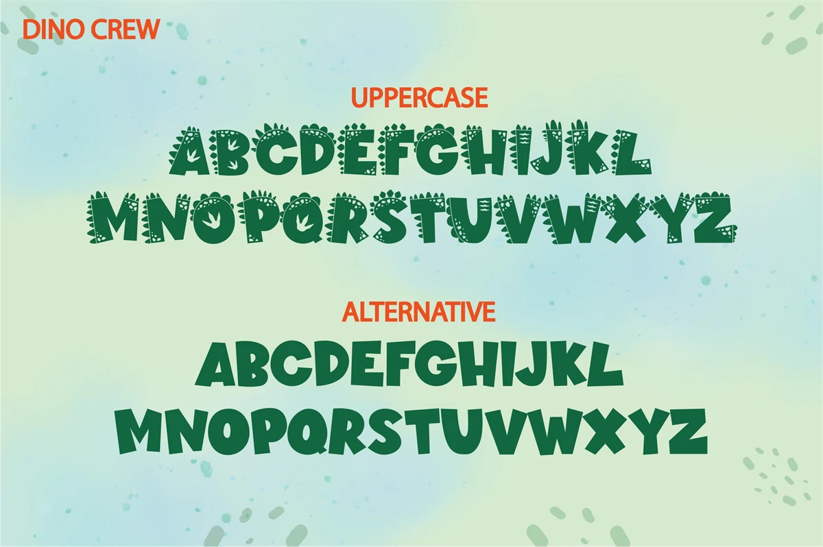 Dino Crew is a playful and whimsical decorative font that is perfect for designs aimed at children or the young at heart. Its cheerful and colorful appearance will bring a sense of fun and joy to any project, making it ideal for book covers, posters, invitations, and more.